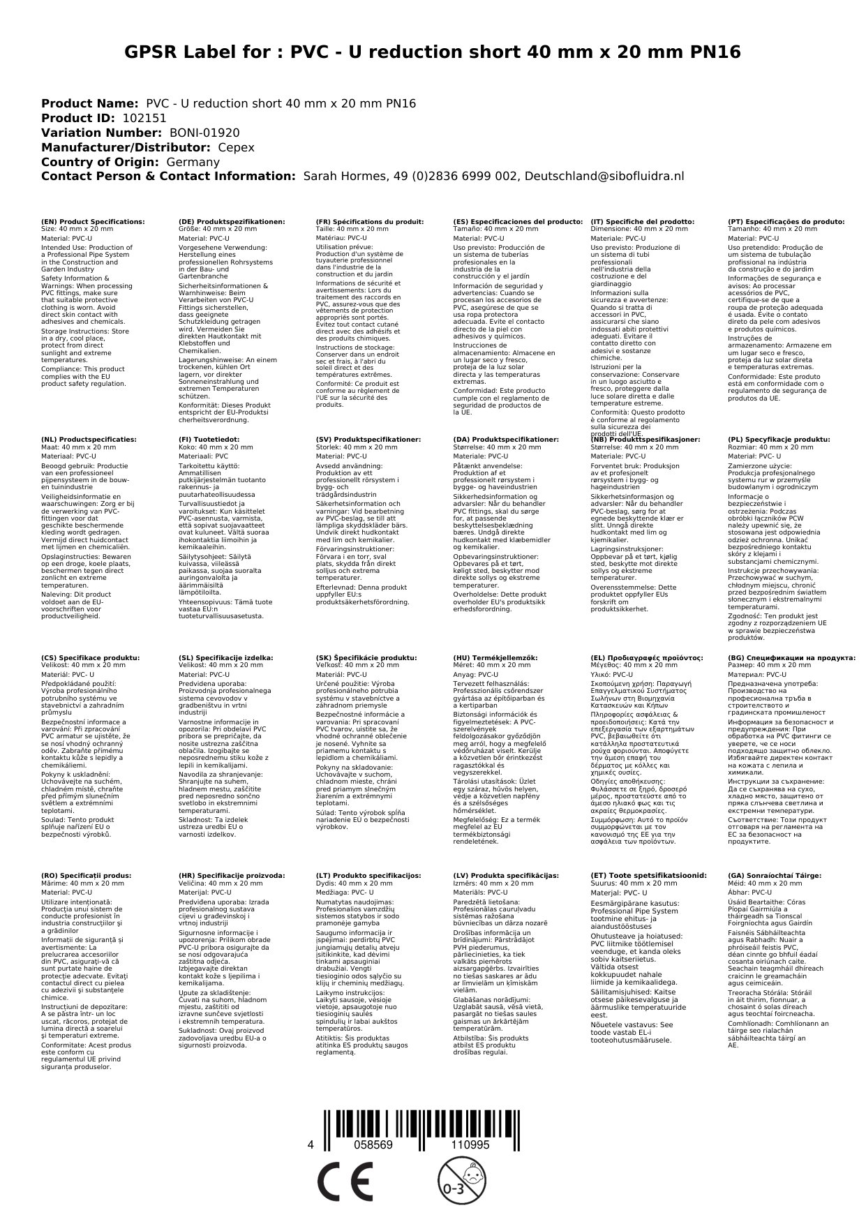 PVC - U Reduktion kurz 40 mm x 20 mm PN16