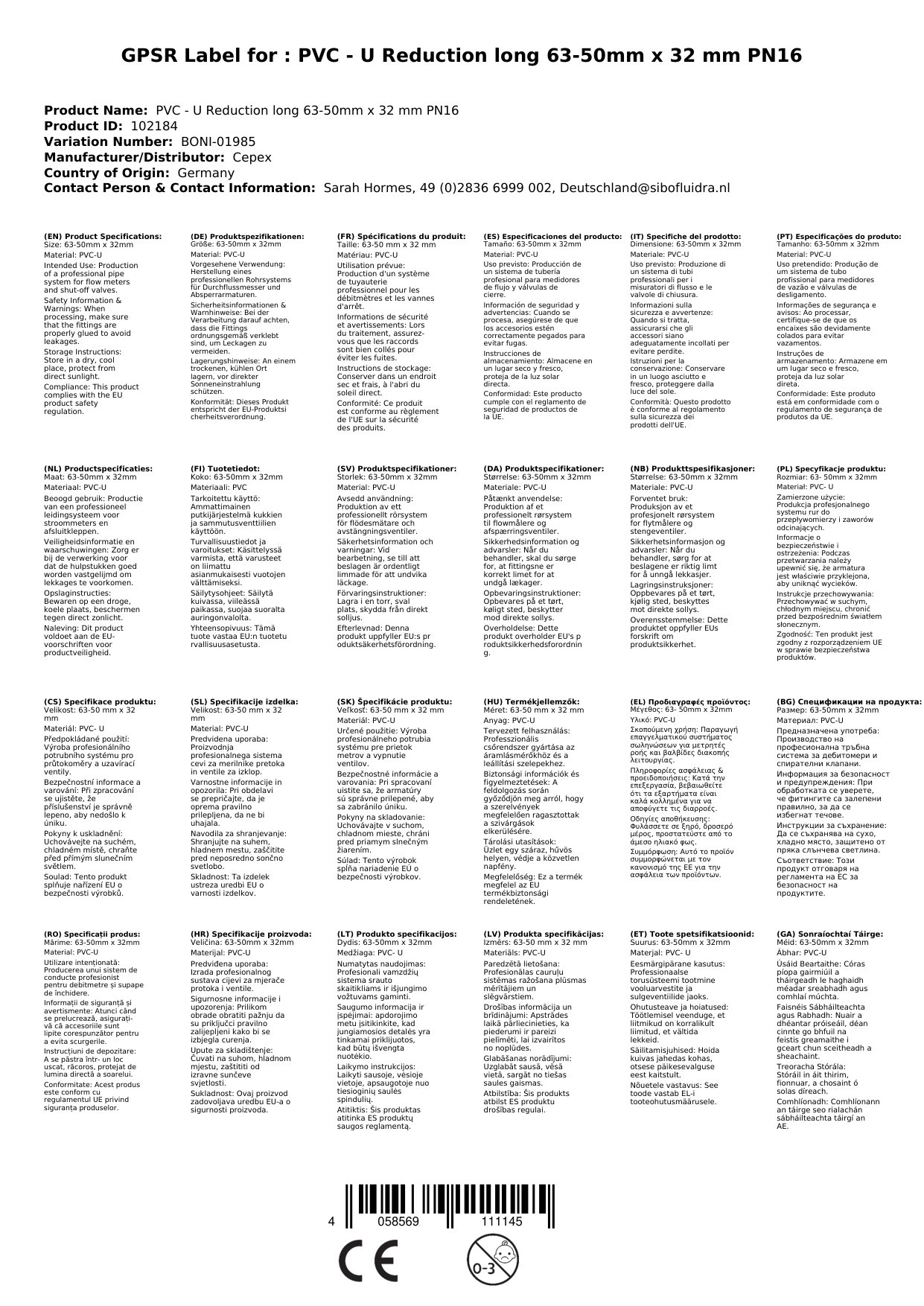 PVC - U Reduktion lang 63-50mm x 32 mm PN16