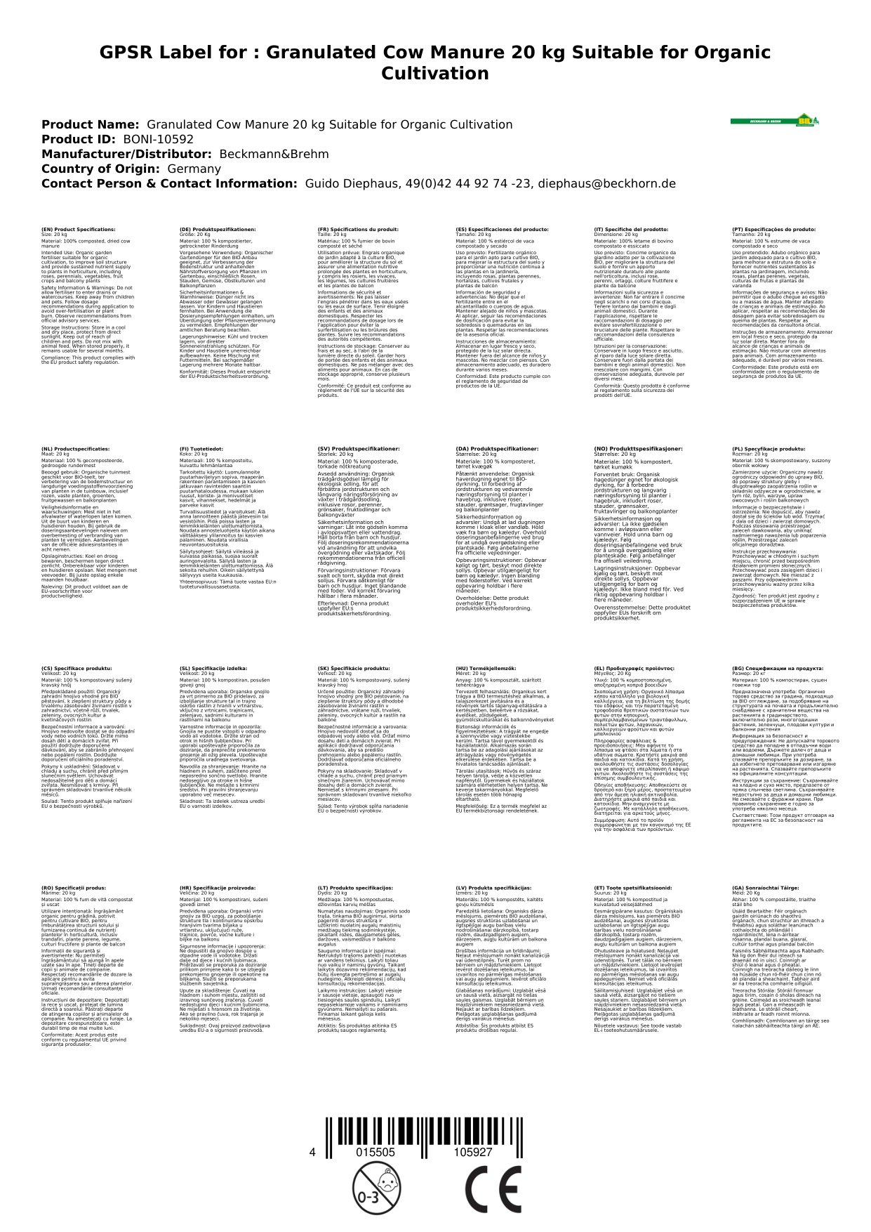 Dieser Rinderdung wird hergestellt in einem schonenden Kompostierungs- und Trocknungsverfahren und ist zulässig für den BIO Anbau nach EG-Öko Verordnung.