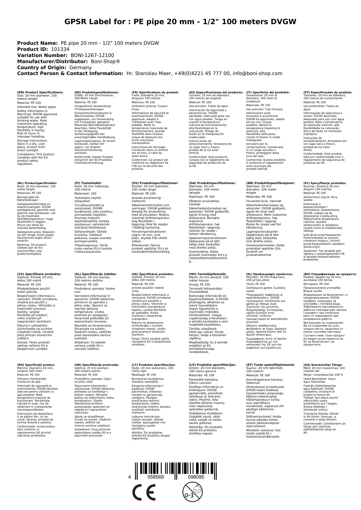 Тази PE тръба за питейна вода е с диаметър 20 мм и дължина 100 метра, което я прави подходяща за различни приложения – от домашни водопроводни системи до поливни инсталации. Изработена е от висококачествен PE 100 материал, гарантиращ здравина и устойчивост. DVGW сертификацията потвърждава, че тръбата е безопасна за пренос на питейна вода. С максимално работно налягане от 12,5 бара, тя е надеждна и при високи изисквания.