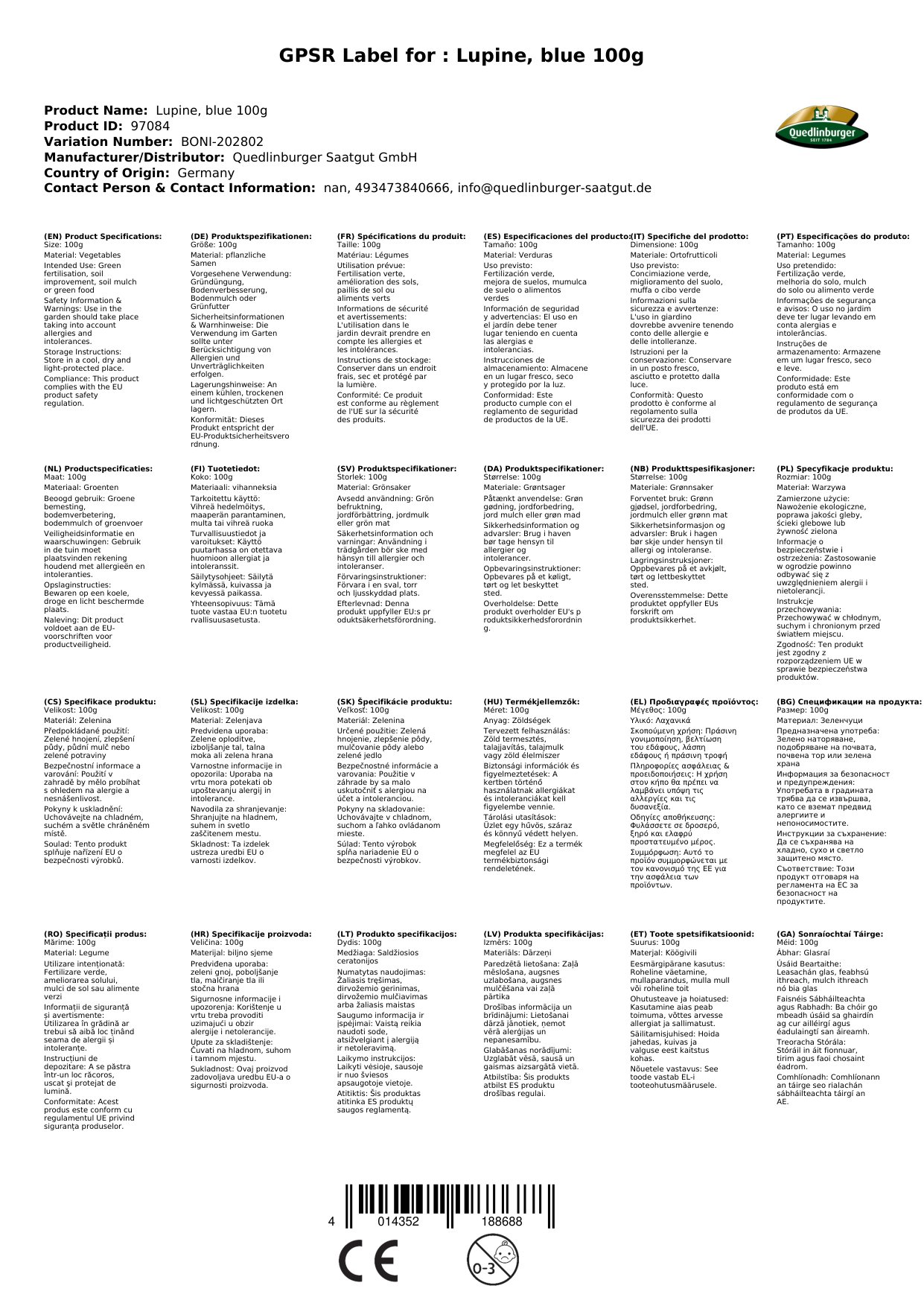 Stellen Sie eine Frage, um mehr über das Produkt zu erfahrenInfo: Einjährige Gründüngungspflanze mit blauen Blütenständen, die eine hervorragende Nahrungsquelle für viele Insekten darstellt. Sehr guter Bodenverbesserer mit sehr hohem Vorfruchtwert (Stickstoffsammler). Verwendung als Bodenmulch oder Grünfutter. Laub und Körner sind auch zur Fütterung geeignet.