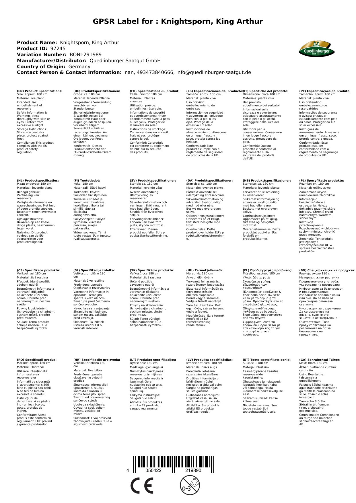 Stellen Sie eine Frage, um mehr über das Produkt zu erfahrenPflege: Die Aussaat im Frühjahr erfolgt im Warmen (Gewächshaus/Fensterbank), gesät wird flach (Lichtkeimer), andrücken und gleichmäßig feucht halten. Die Jungpflanzen ab Mai in das Freiland bringen, vorher allmählich an die Außentemperaturen gewöhnen (abhärten). Die Herbstaussaat erfolgt im Freiland in Töpfen/Schalen. Pflanzabstand 80x80 cm.