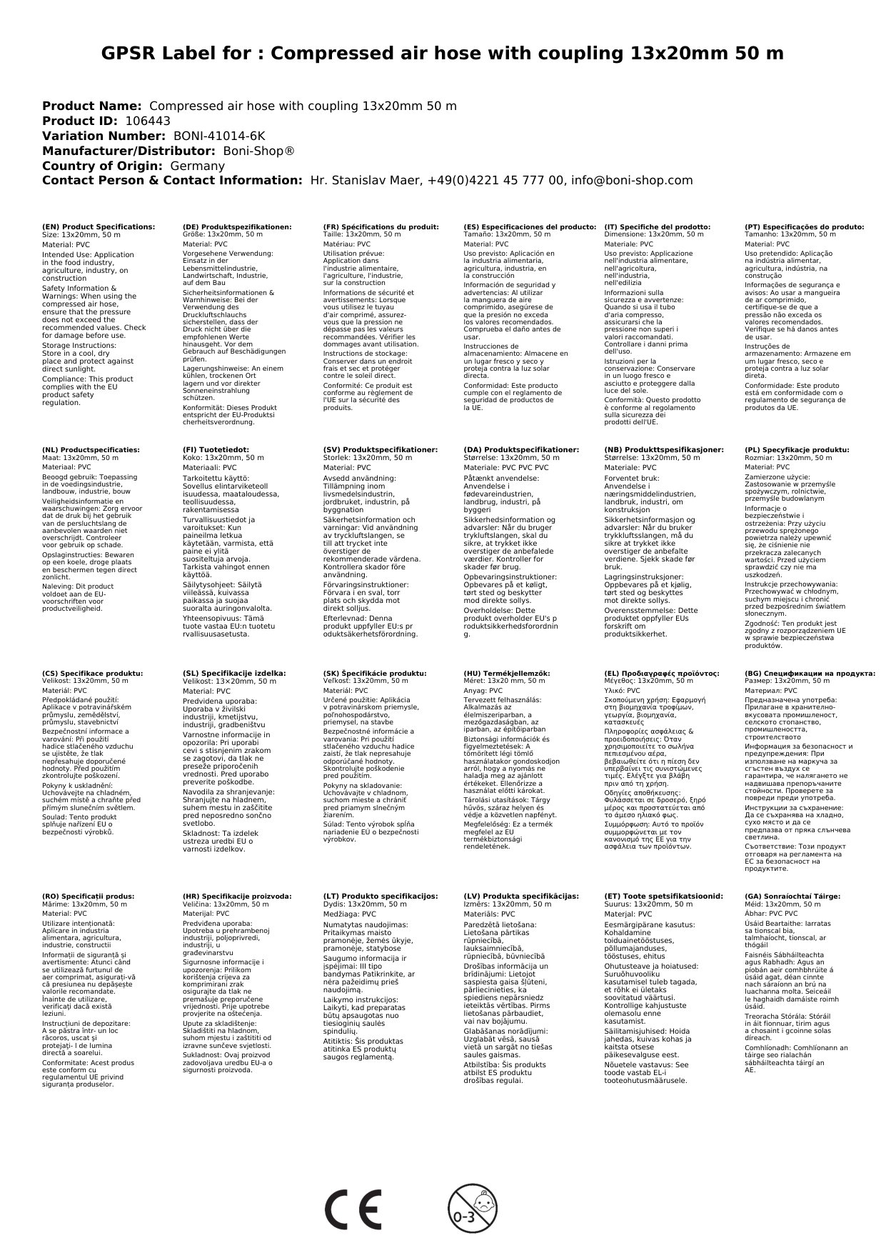 Unser Druckluftschlauch ist komplett montiert mit 2-Ohr-Schellen und NW7.2 Messing-Industrie-Kupplungen. Die PVC-Druckschläuche sind bestens geeignet für den Einsatz in der Lebensmittelindustrie, Landwirtschaft, Industrie, auf dem Bau, in der Werkstatt oder im privaten Bereich. Ob zum Anschließen von Druckluft wie Kompressoren oder Druckluftwerkzeugen, zum Durchleiten von Flüssigkeiten, Chemikalien oder Luft – hiermit sind Sie bestens gerüstet. Mit einem Arbeitsdruck von 15 bar und einem Berstdruck von 45 bar hält dieser Schlauch auch hohen Belastungen stand. Warum das für Dich wichtig ist: Du erhältst einen vielseitig einsetzbaren und langlebigen Druckluftschlauch, der Deinen Anforderungen in verschiedenen Anwendungsbereichen gerecht wird und teure Reparaturen vermeidet.