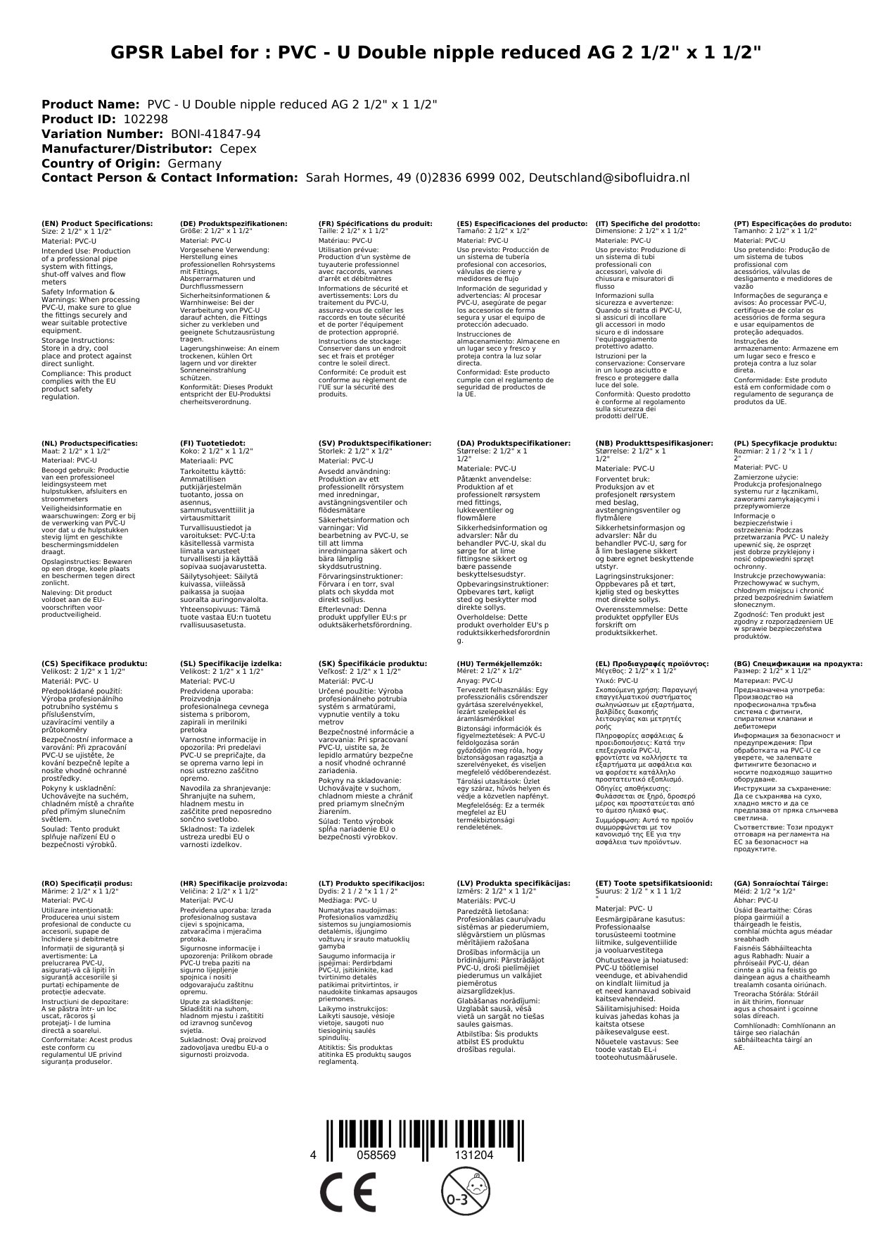 PVC - U Doppelnippel reduziert AG 2 1/2" x 1 1/2"