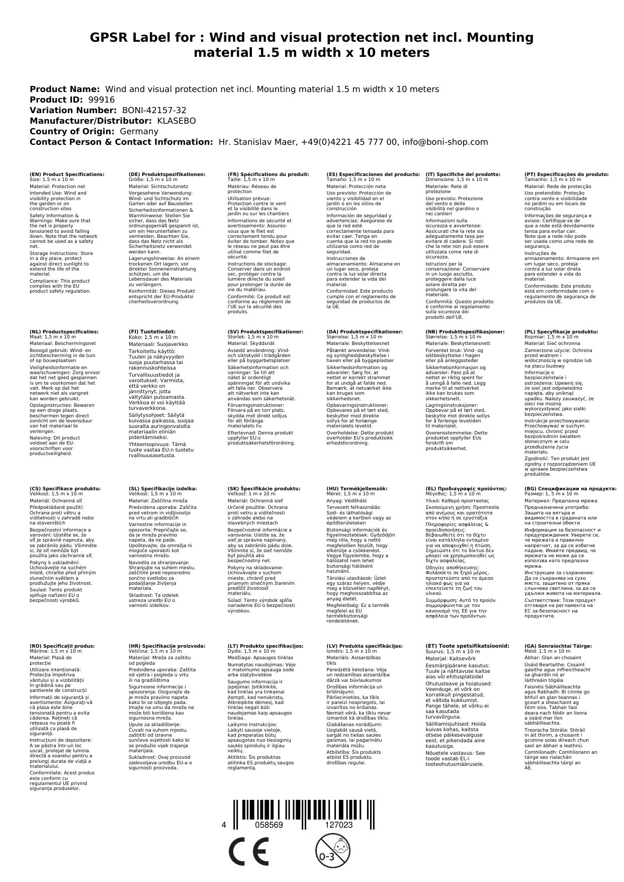 - Pflege: Reinigen Sie das Netz bei Bedarf mit Wasser und einem milden Reinigungsmittel.
