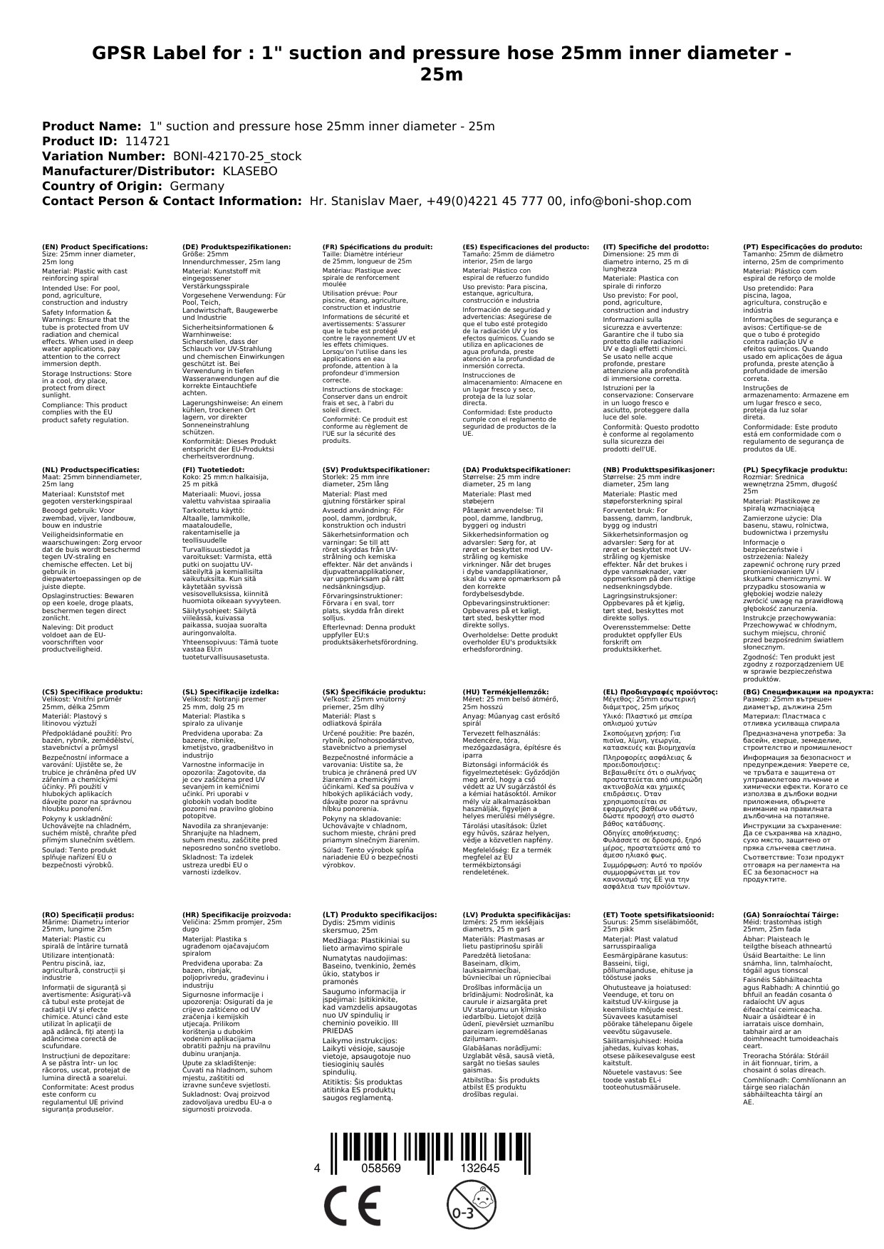 - REACH- und RoHS-Konformität: Der Schlauch entspricht den europäischen Richtlinien 2007/19/EC und 10-2011 gem. A-B-C.