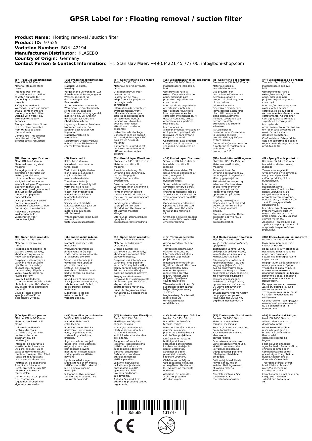 | Bestandteile | Schwimmerkugel, Edelstahl Ring, Edelstahl Schelle, Messing Fußventil mit Öse, 25 mm Schlauchtülle |