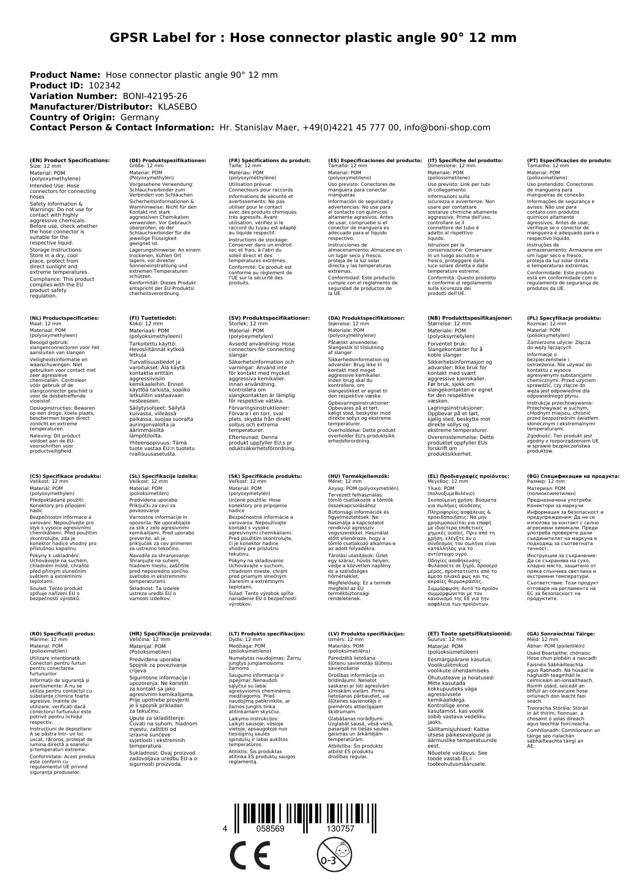 - Chemikalienbeständigkeit: POM ist beständig gegenüber Kohlenwasserstoffen, Benzin, Diesel, Ölen, Fetten, Chlorkohlenwasserstoff, Laugen und Salzlösungen. Das bedeutet für Sie, dass Sie den Verbinder vielseitig einsetzen können, ohne sich Sorgen um Beschädigungen durch aggressive Medien machen zu müssen.