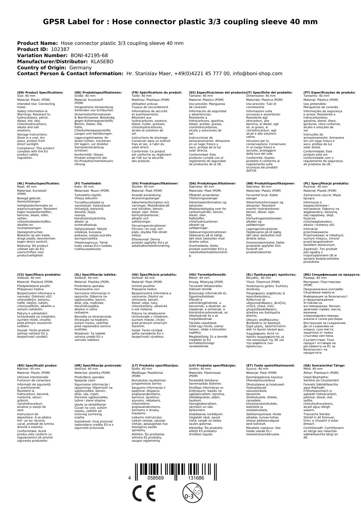 - Materialtyp: Polyacetal Copolymer Standardmaterial Schlauchverbinder