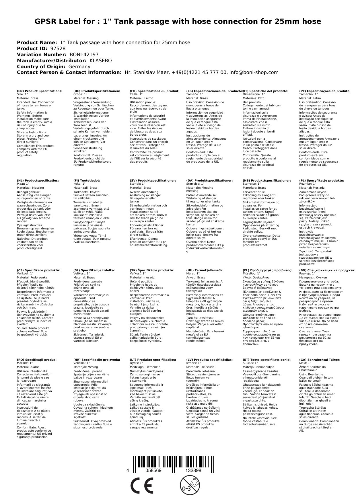 Tankdurchführung, Regentonnen Durchführung 1 Zoll, Messing Schlauchstutzen 25mm