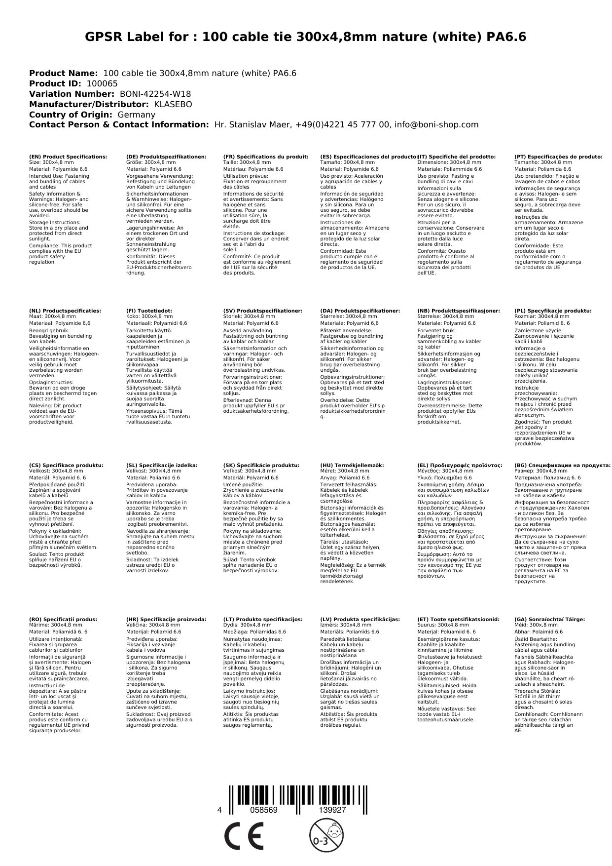 Entsorgen Sie die Kabelbinder bitte über den Hausmüll oder Wertstoffhof gemäß den lokalen Bestimmungen. Polyamid 6.6 ist nicht biologisch abbaubar.