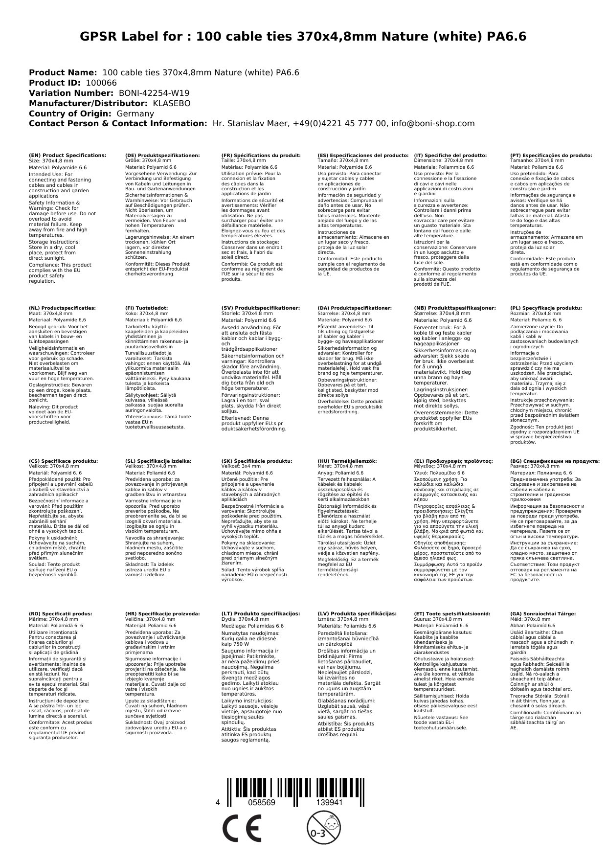 Kabelbinder, 100 Stück, 370x4,8mm natur, PA6.6 Kunststoffbinder