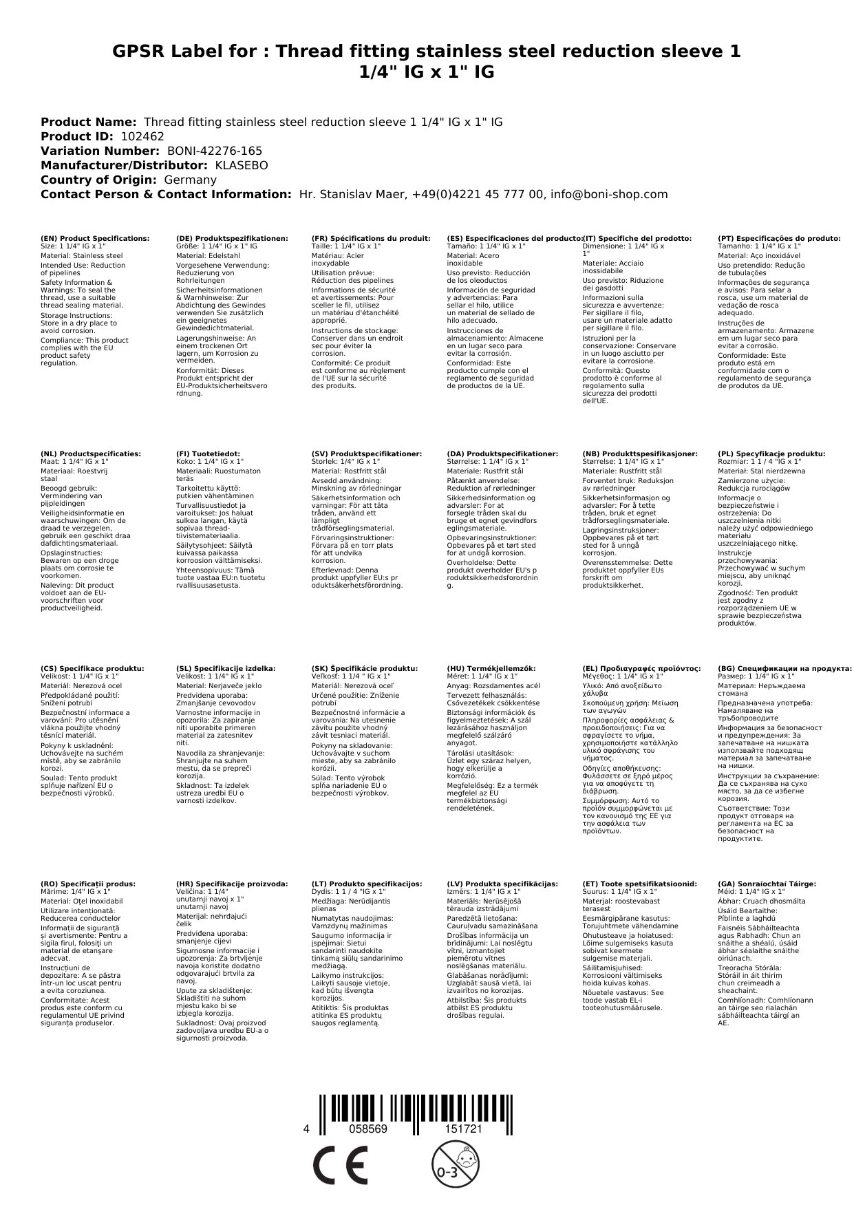 Edelstahl Reduziermuffe, Gewindefitting, 1 1/4" IG x 1" IG, V4A, Boni-Shop