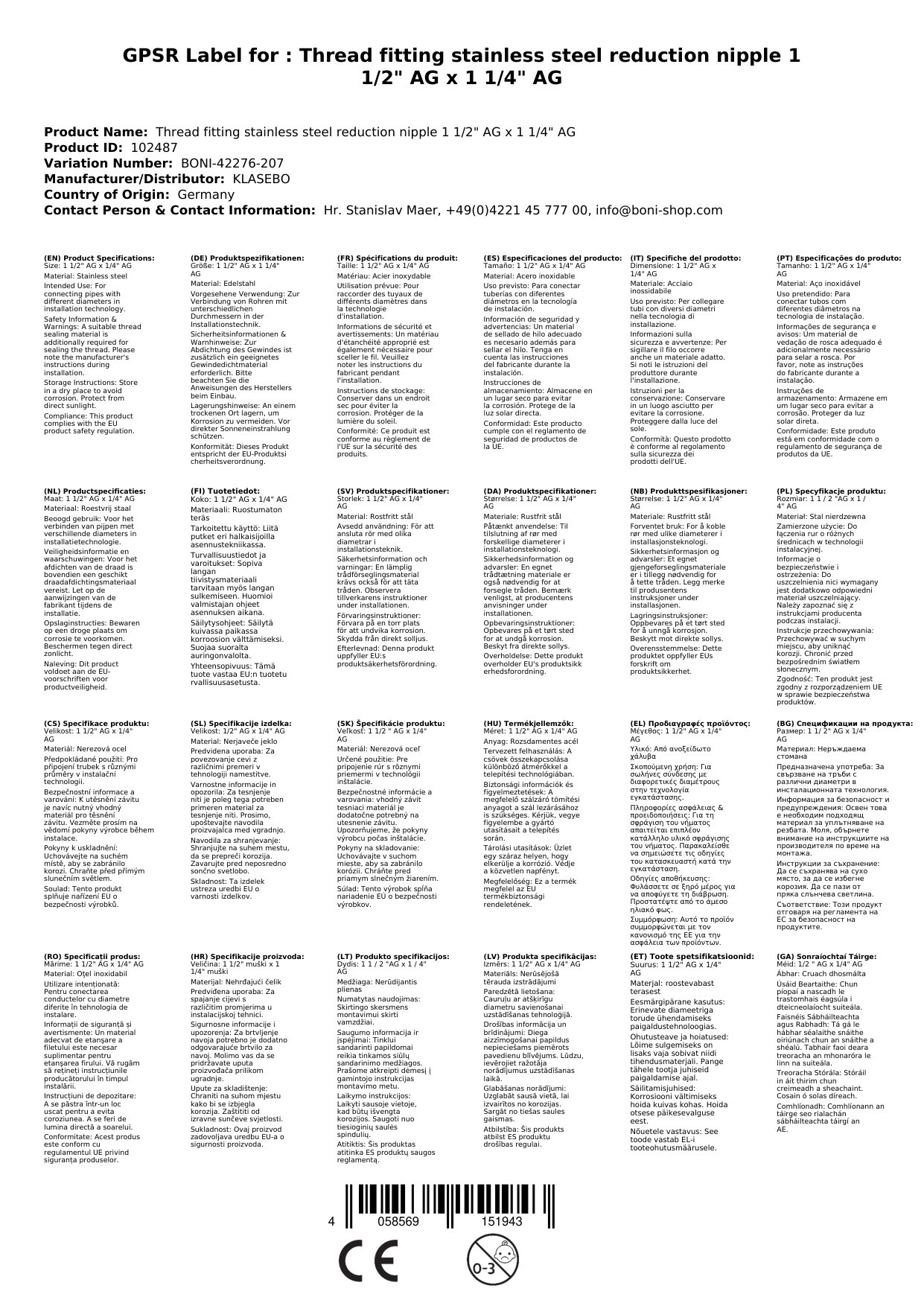 Reduziernippel aus Edelstahl mit beidseitigem Außengewinde in unterschiedlichen Durchmessern. Zur Abdichtung des Gewindes benötigen Sie zusätzlich ein geeignetes Gewindedichtmaterial. Hier eignet sich Hanf oder Teflonband. Bei dem Gewinde handelt es sich um das in der Wassertechnik gängige Whitworth-Rohrgewinde. Die Außengewinde sind konisch.