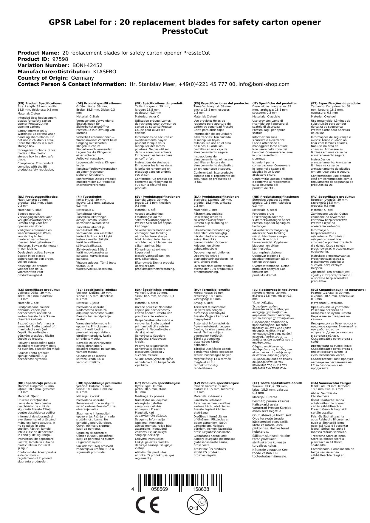 20 Ersatzklingen für Sicherheitskartonöffner PresstoCut