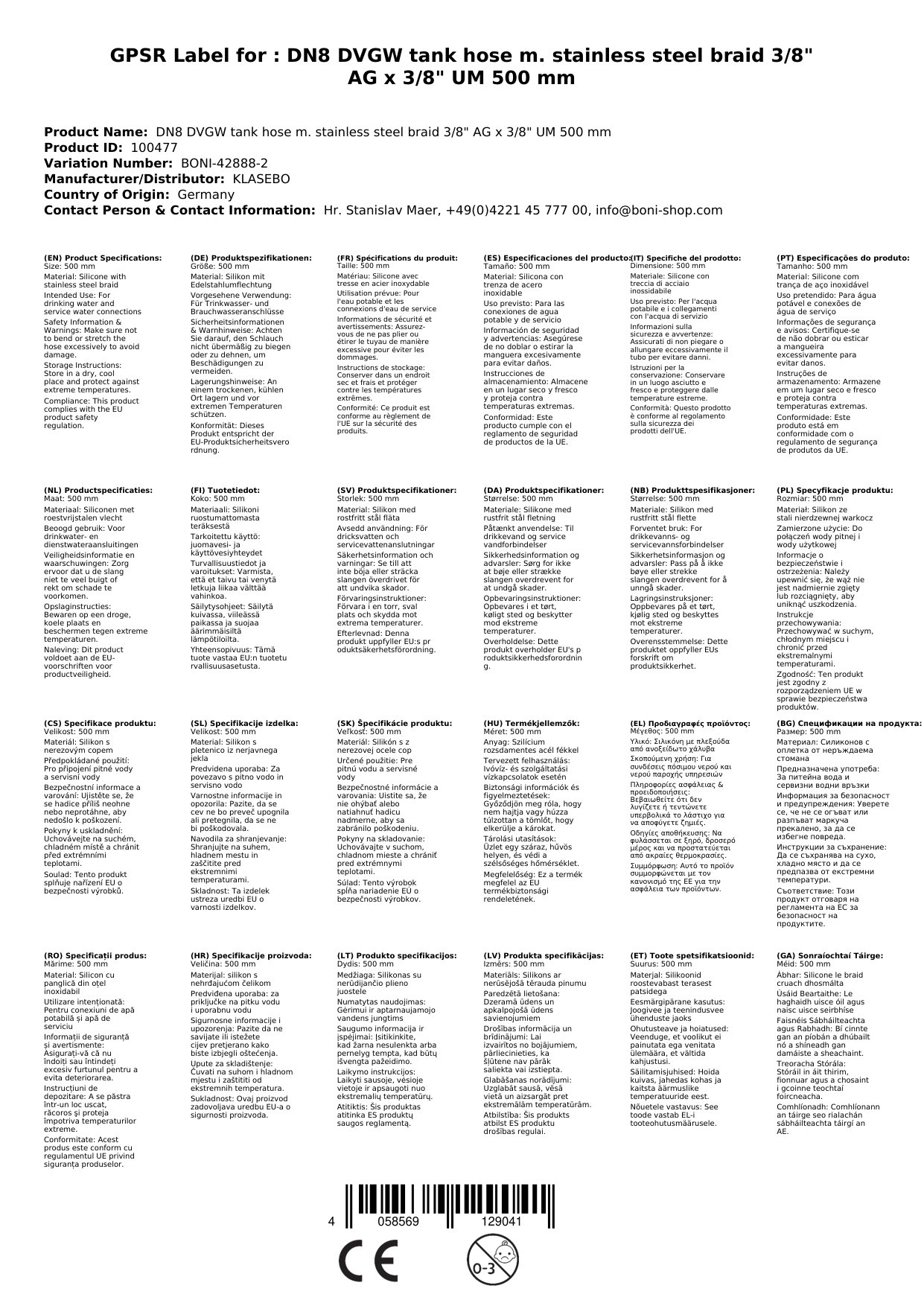 | Material Umflechtung | Edelstahl AISI304L |