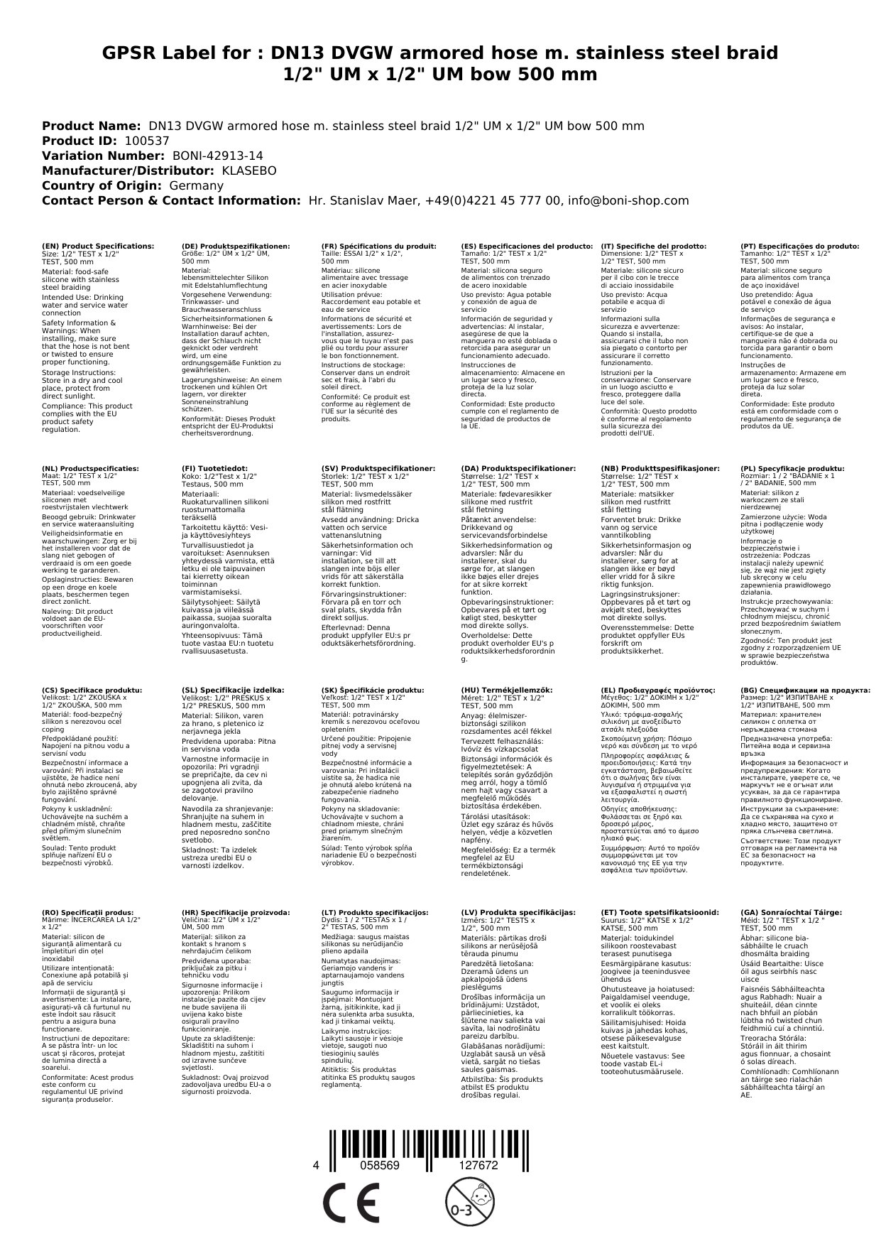 | Material | Edelstahlumflechtung AISI304L, Silikoninnenschlauch |