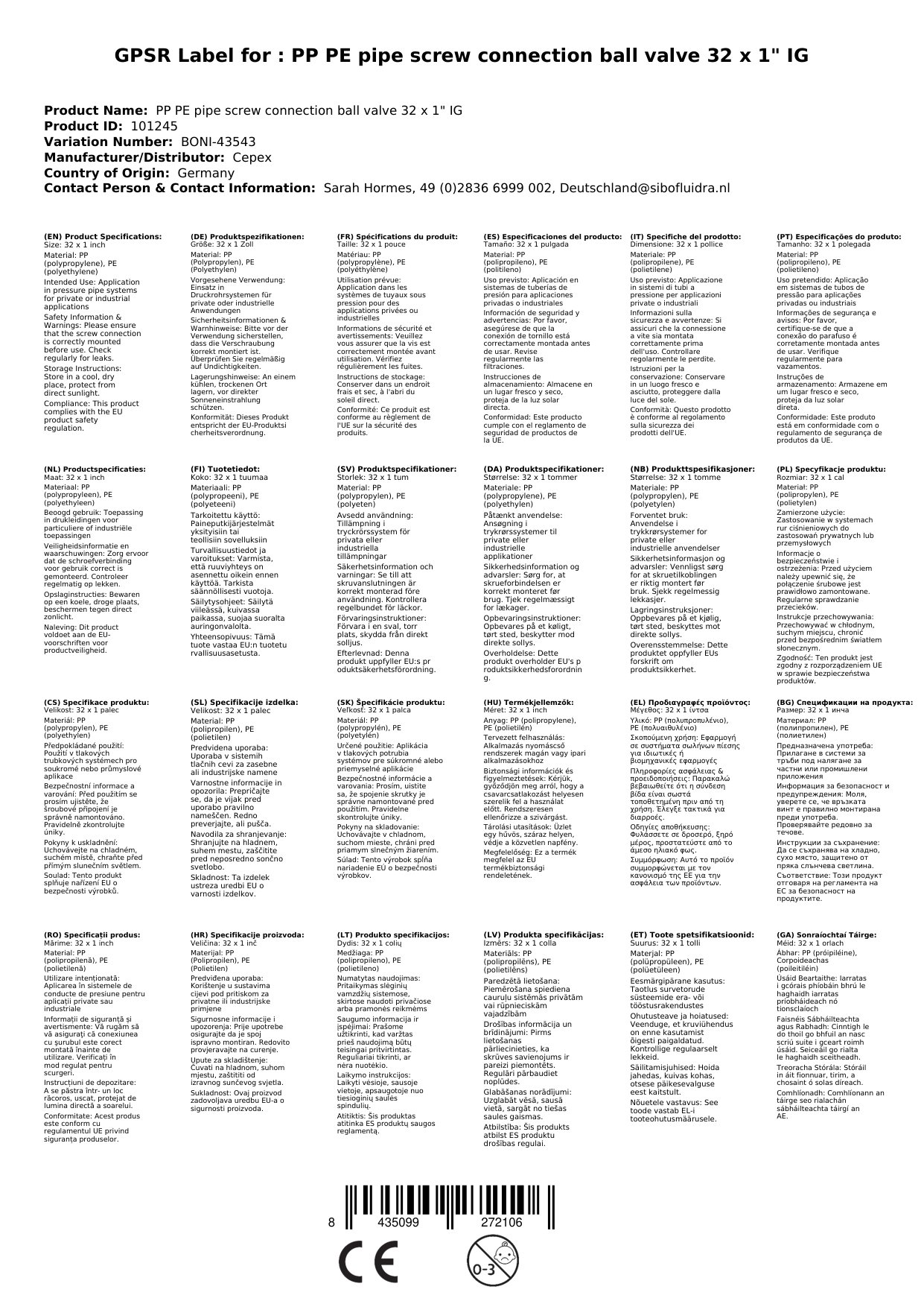 Sie ist optimal für die Verschraubung an PE-Rohren gemäß der Normen ISO 11922; DIN 8072/8074 und UNE 53131 geeignet.