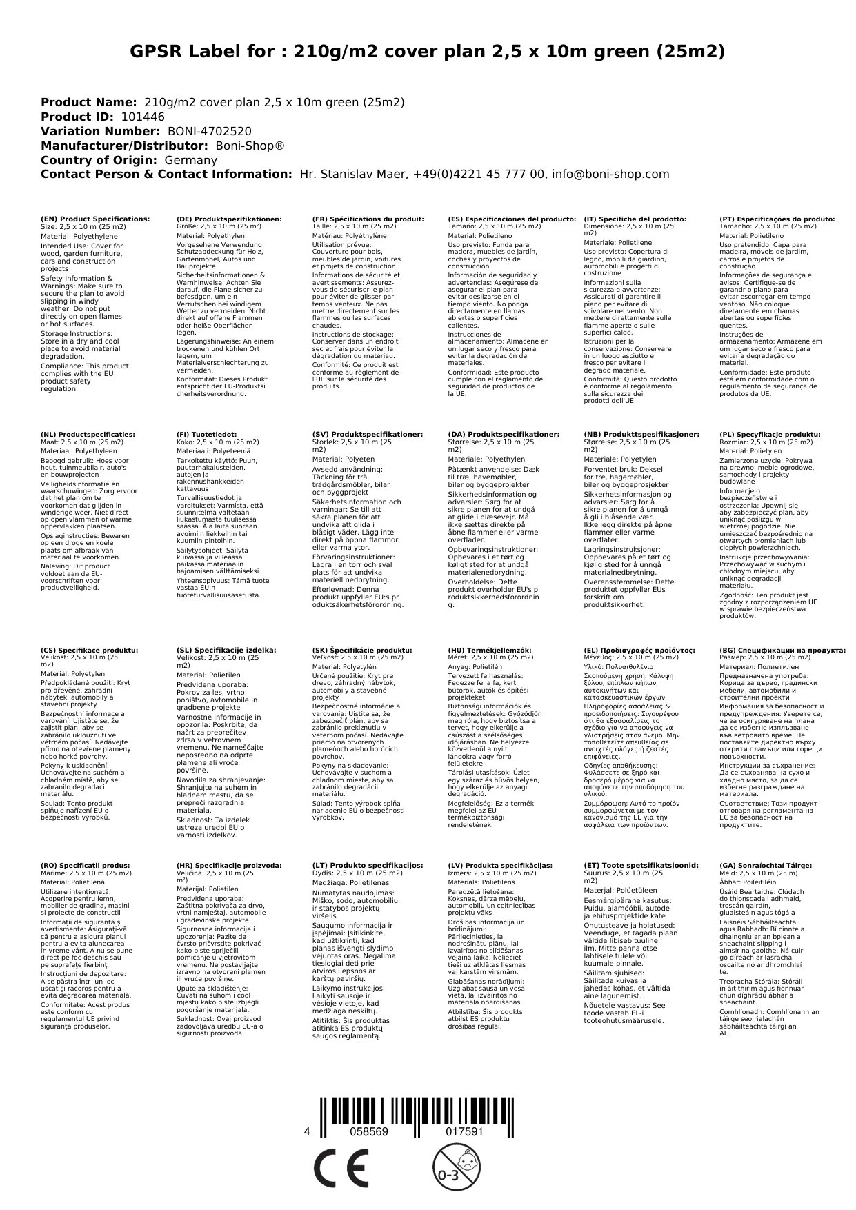 - Ca. 210g/m²: Mit einer Dichte von 210g/m² bietet die Plane ein optimales Gleichgewicht zwischen Gewicht und Robustheit. Sie erhalten eine stabile und dennoch handliche Plane.
