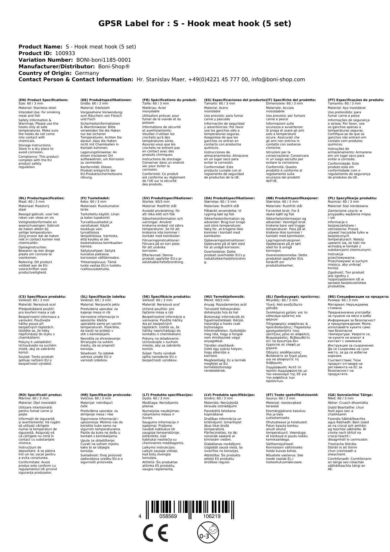 Fleischhaken 5er Set, S Haken, Edelstahl 60mm, Räucherhaken