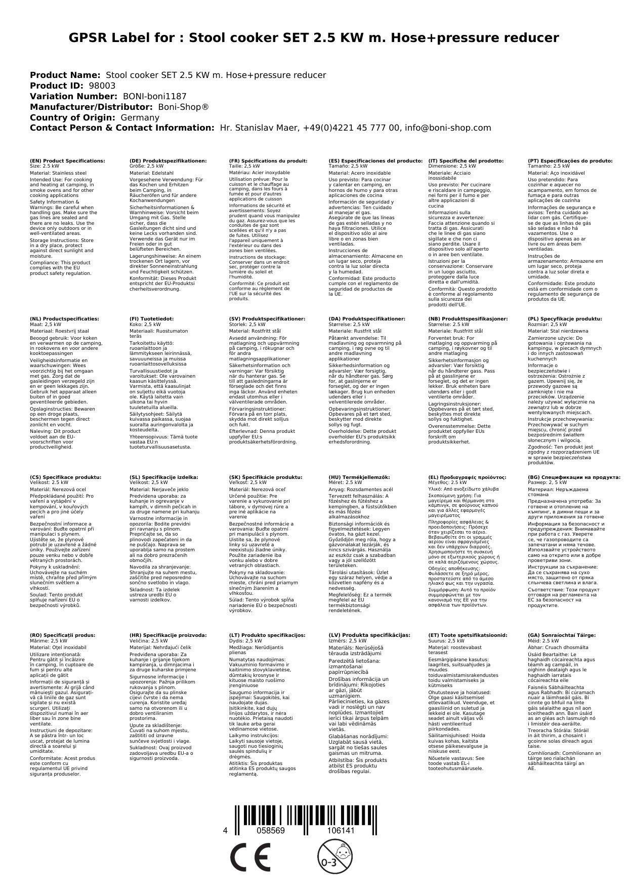 This portable gas stove set delivers 2.5 KW of power, making it suitable for a wide range of cooking applications. It features a stainless steel burner for durability and even heat distribution. The set includes a 1-meter MD hose and a low-pressure regulator for safe and easy connection to propane or butane tanks. Enjoy consistent performance whether you're camping, cooking outdoors, or using it with a smoker.