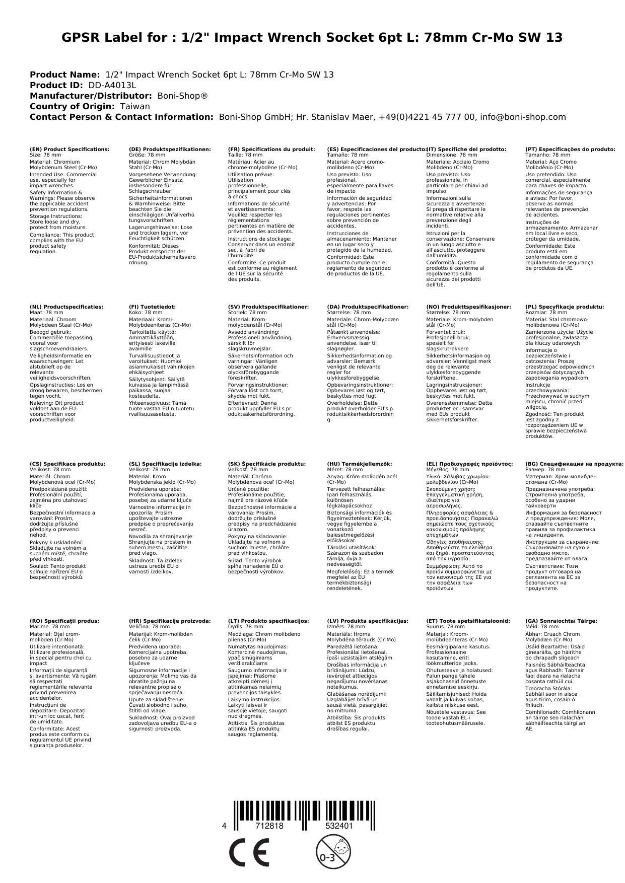 Diese Schlagschraubernuss ist aus hochwertigem Chrom-Molybdän-Stahl (Cr-Mo) gefertigt, was eine lange Lebensdauer und hohe Belastbarkeit garantiert. Die Schlüsselweite beträgt SW 13, passend für 1/2 Zoll Schlagschrauber. Die präzise Fertigung sorgt für eine optimale Kraftübertragung und verhindert Beschädigungen an Schrauben und Muttern. Sie können sich auf Industequalität verlassen, die höchsten Ansprüchen genügt.