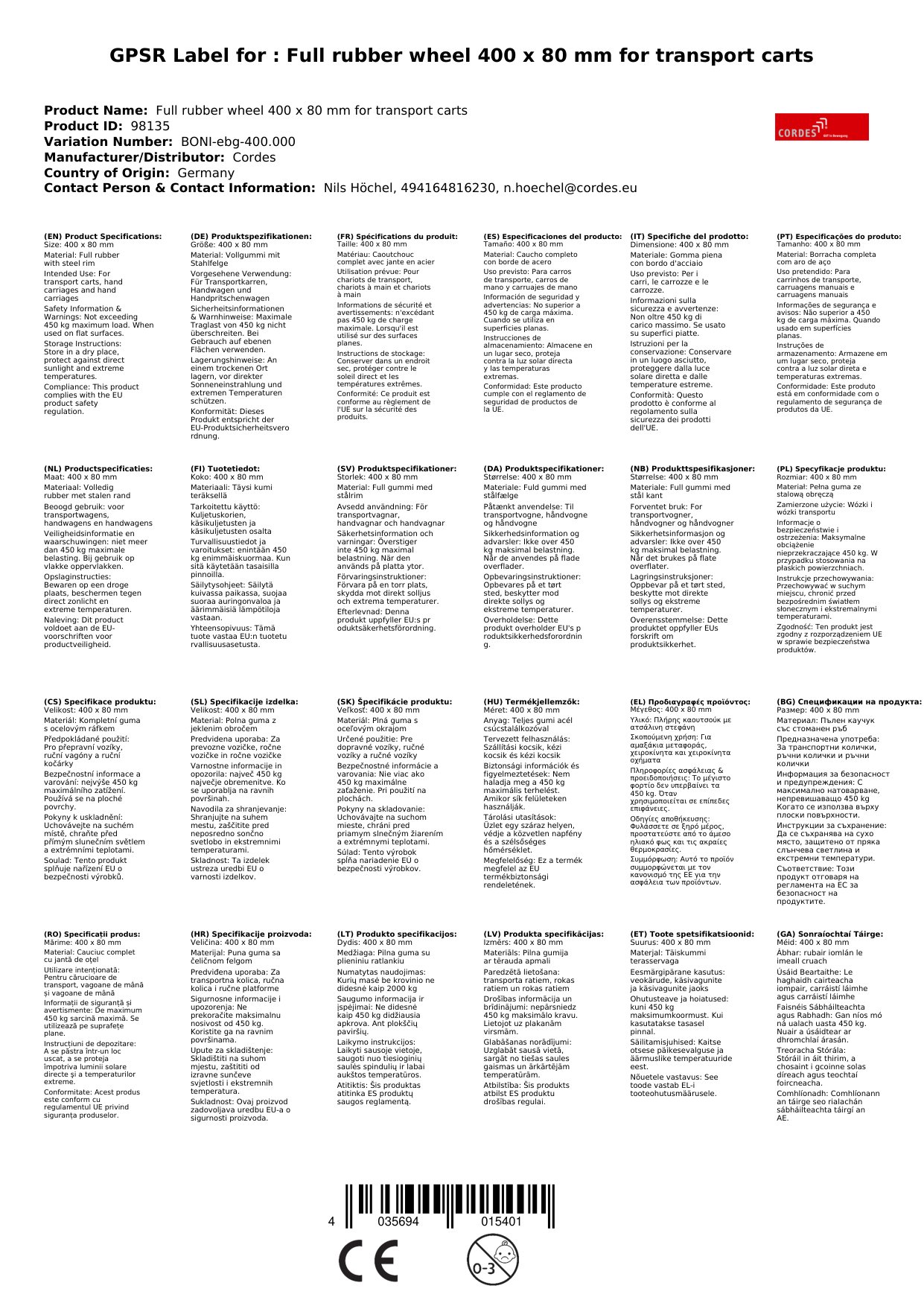 | Abmessungen (Rad Ø x Radbreite) | 400 x 80 mm |