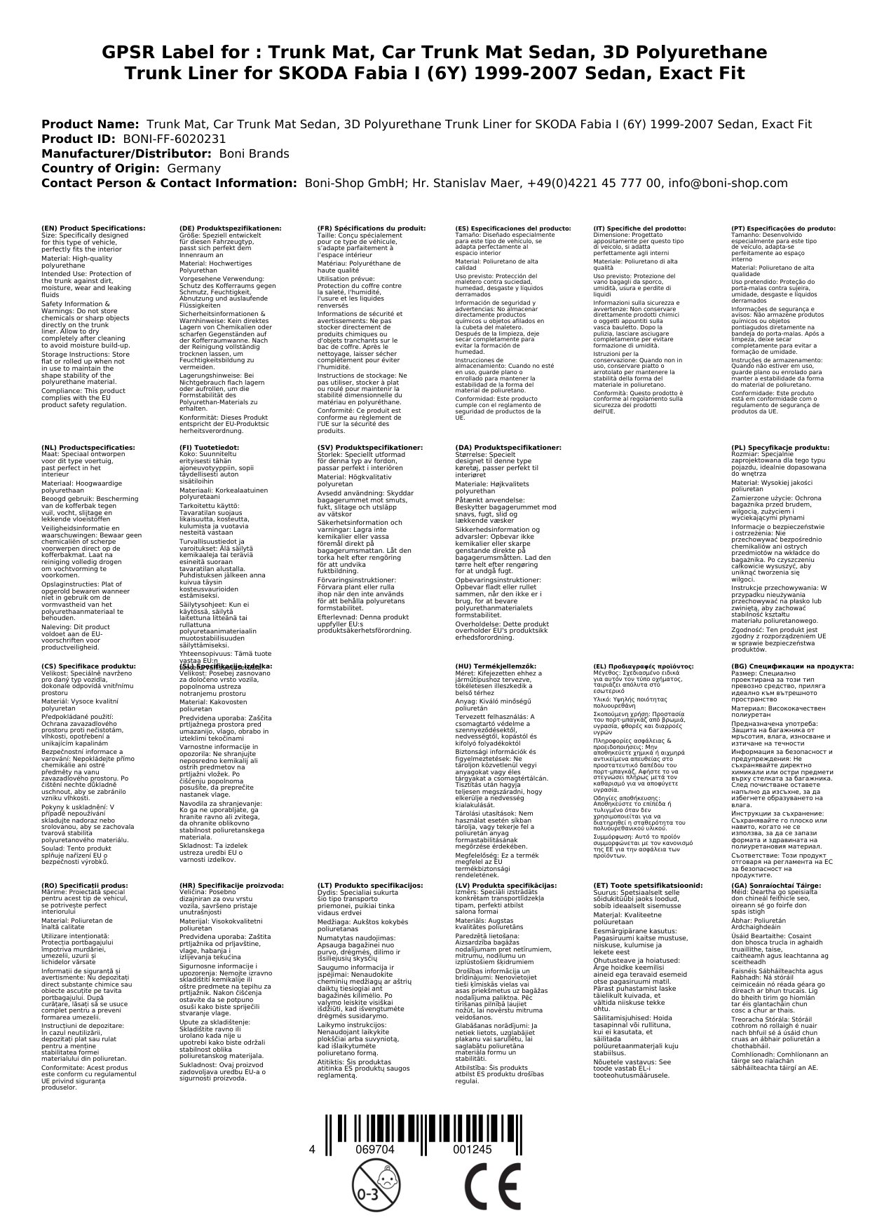 Technische Daten Ihrer Kofferraummatte