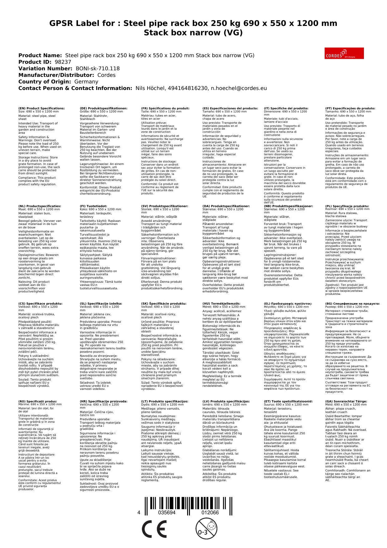 Sackkarre Stahlrohr, 250 kg, Stapelkarre, schmal