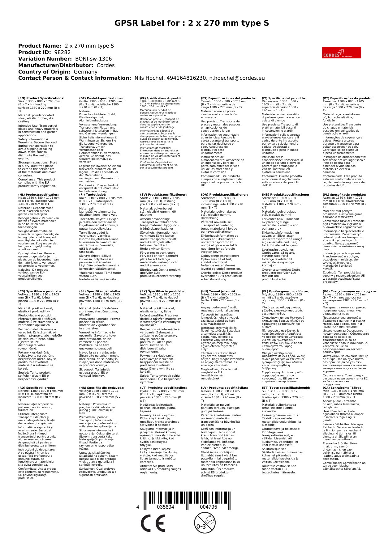 Der Plattenwagen ist für verschiedene Plattenformate geeignet. Die Ladefläche beträgt 1380 x 2 x 270 mm.