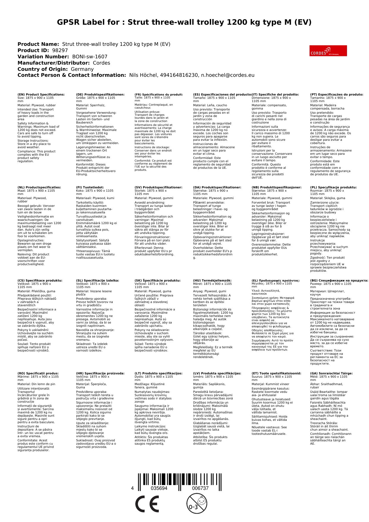 Unser Dreiwandwagen bietet Ihnen eine Traglast von 1200 kg und ist somit ideal für den Transport schwerer Güter. Die Gummibereifung sorgt für einen ruhigen Lauf, und der wasserfest verleimte Sperrholzboden bietet eine stabile Ladefläche. Warum das für Sie wichtig ist: Sie erhalten einen langlebigen und zuverlässigen Wagen, der Ihre Arbeitsabläufe effizienter gestaltet.
