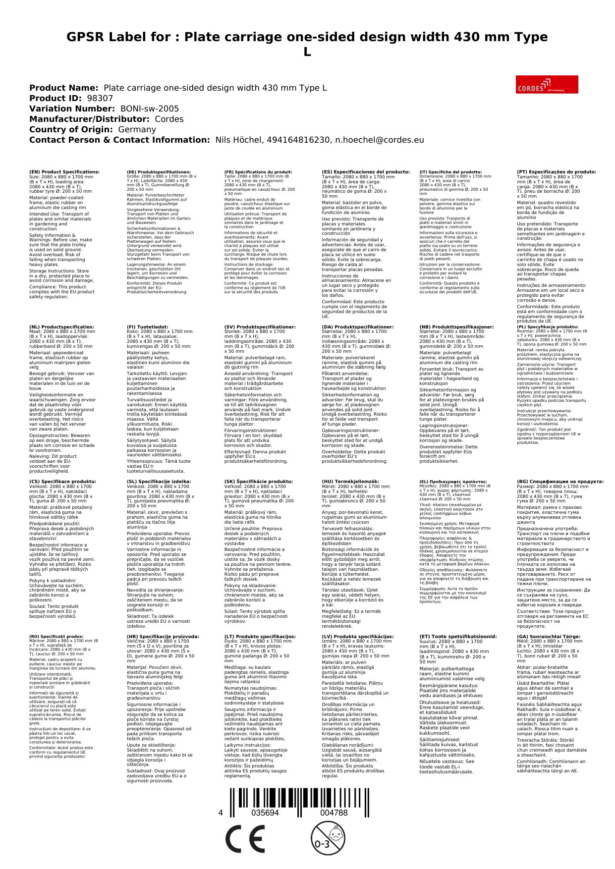 - Wartung: Überprüfen Sie regelmäßig die Bereifung und die Befestigungen. Reinigen Sie den Plattenwagen bei Bedarf mit einem feuchten Tuch.