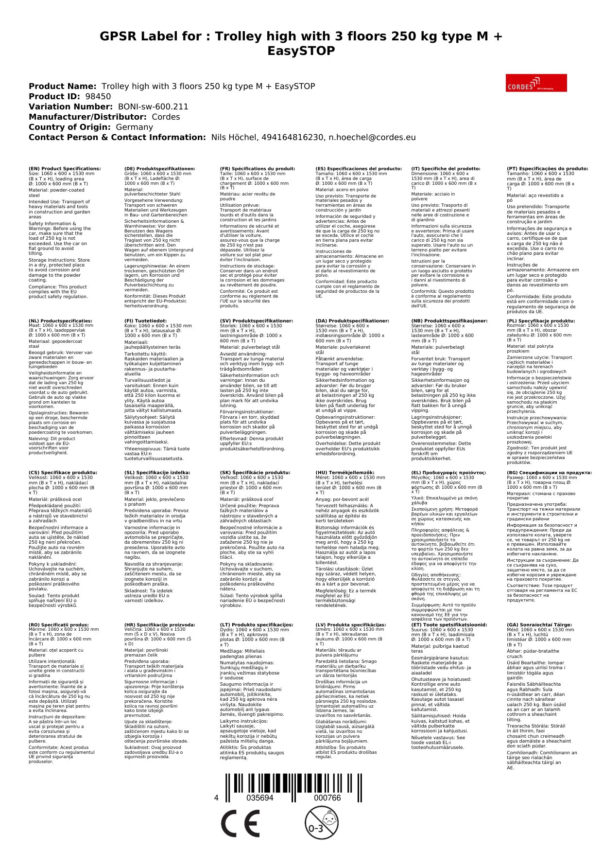 | 1060 x 600 x 1530 mm | 250 kg | 1000 x 600 mm | Gummi, Ø 160 x 40 mm | Enzianblau (RAL 5010) |