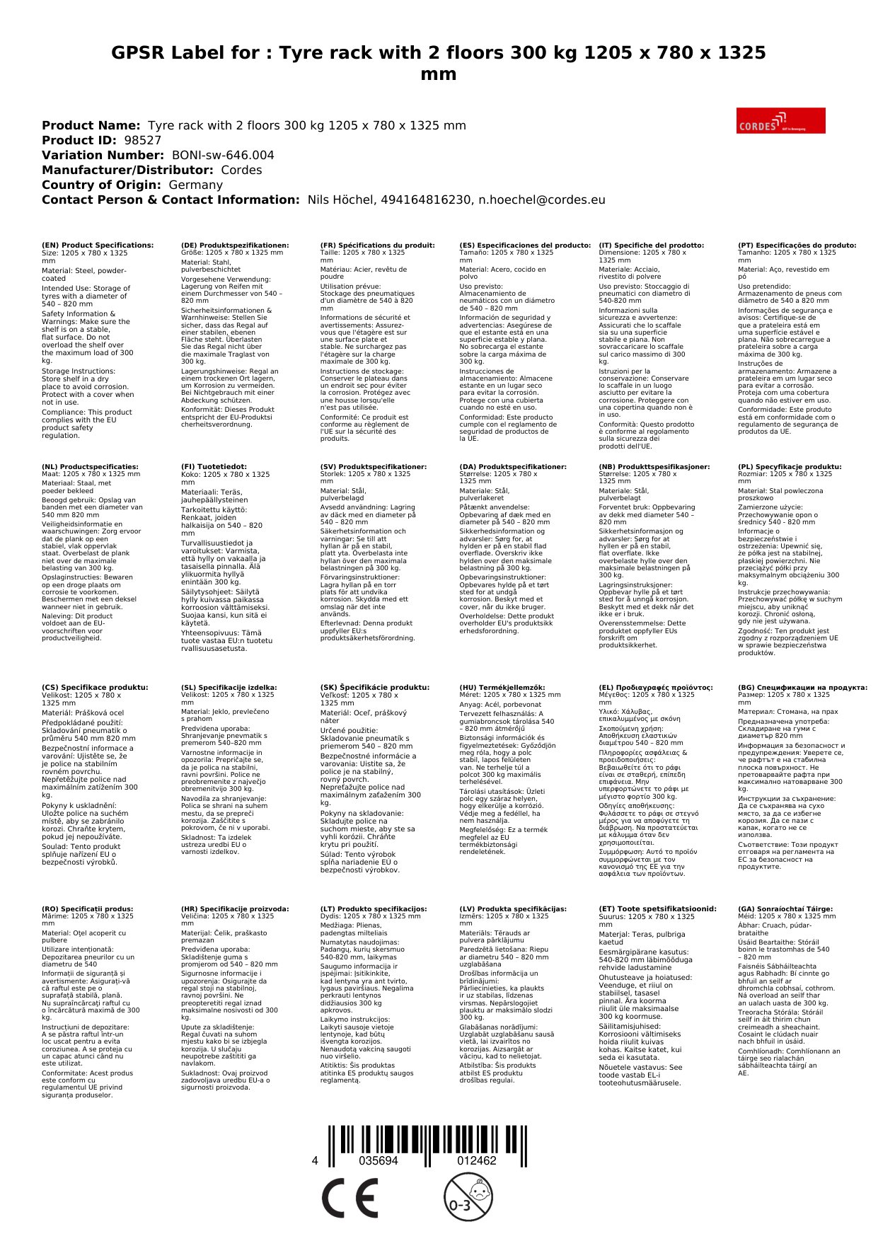 - Platzsparende Lösung: Dank der kompakten Maße (1205 x 780 x 1325 mm) findet das Reifenregal auch in kleineren Räumen Platz.