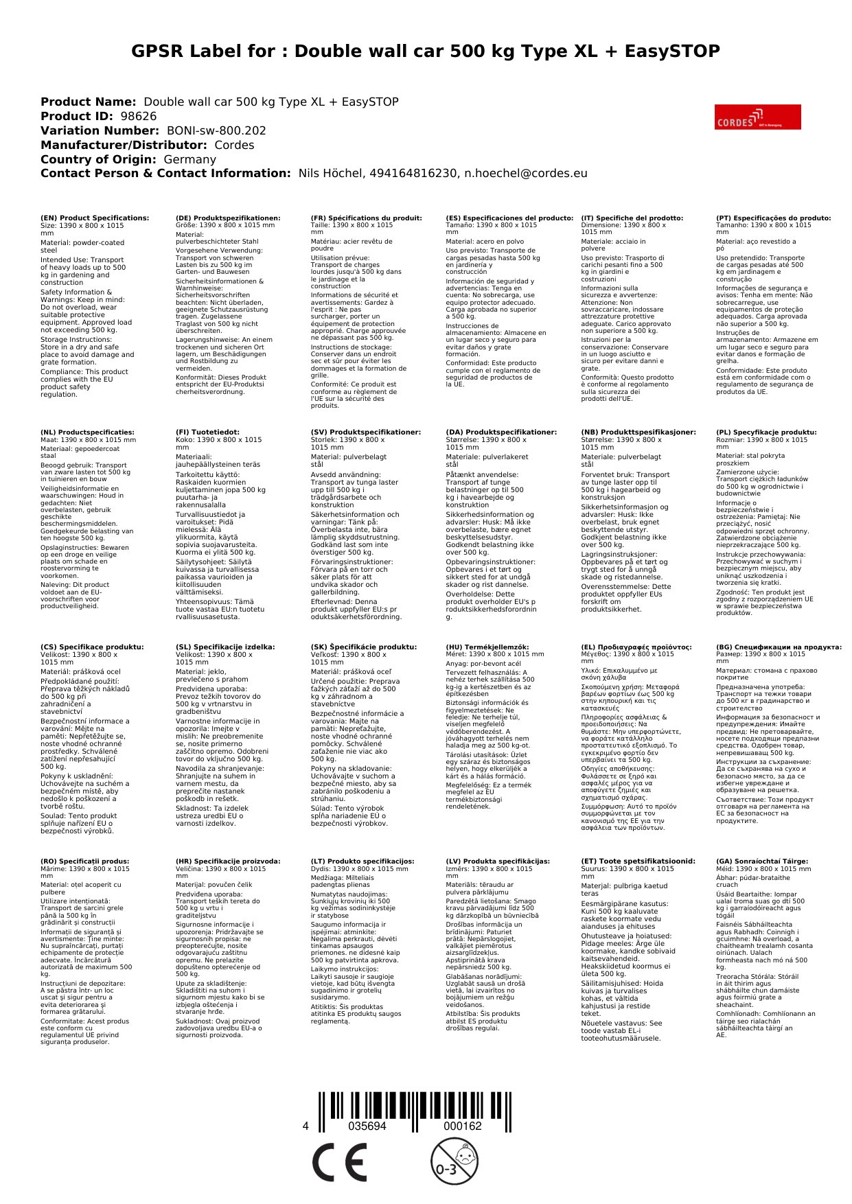 Der Wagen ist pulverbeschichtet und somit gut vor Witterungseinflüssen geschützt. Für den dauerhaften Einsatz im Außenbereich empfehlen wir jedoch, den Wagen regelmäßig zu reinigen und zu pflegen.