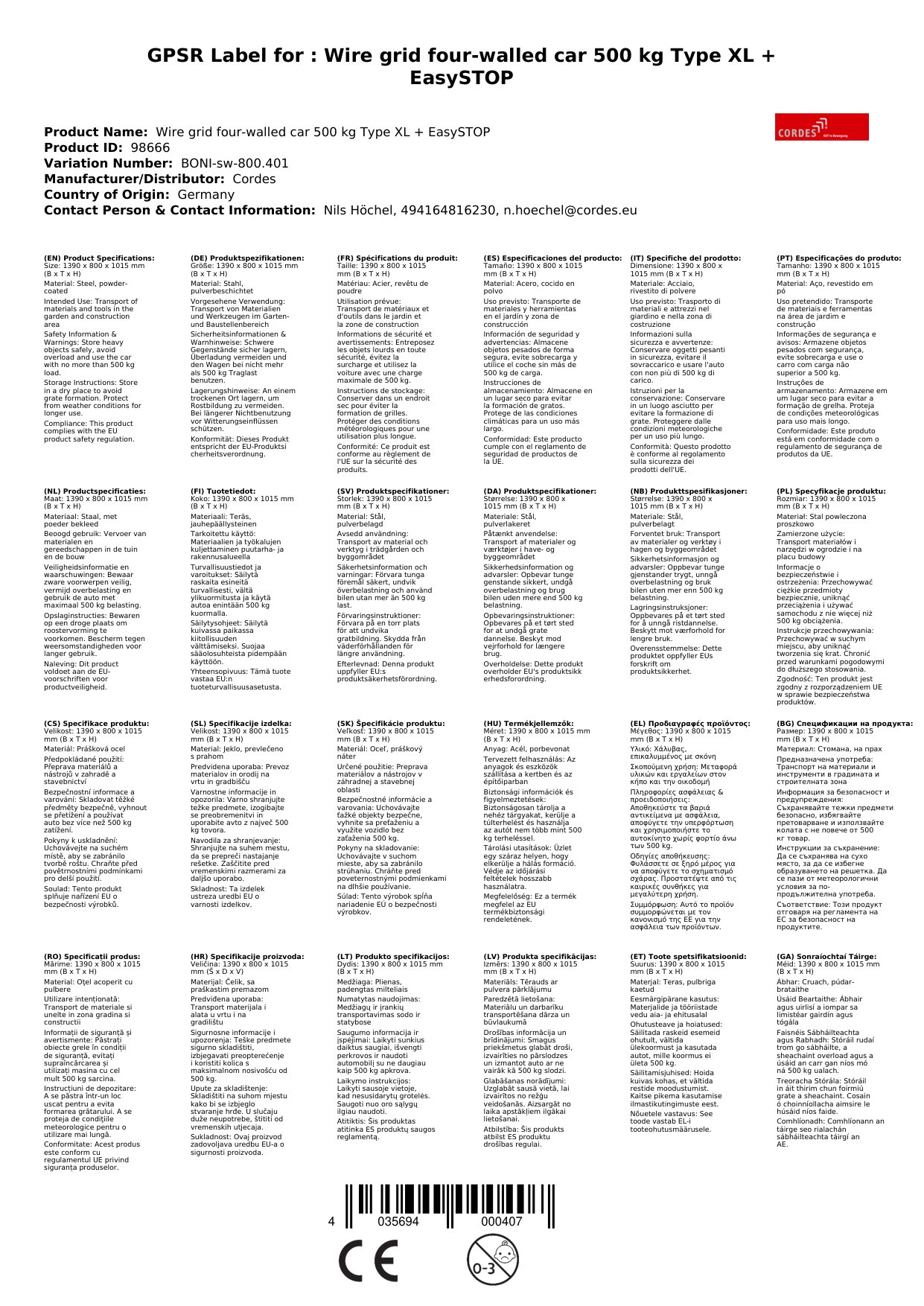 Drahtgitter Vierwandwagen 500 kg Typ XL + EasySTOP