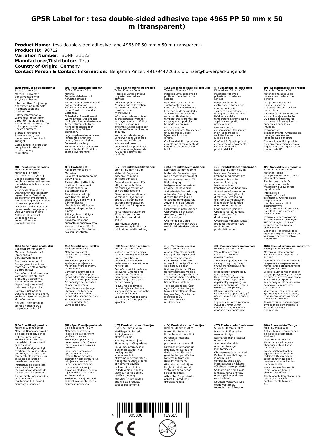 tesafix® 4965 ist ein doppelseitig klebendes, transparentes Polyesterklebeband mit Acrylatklebmasse.