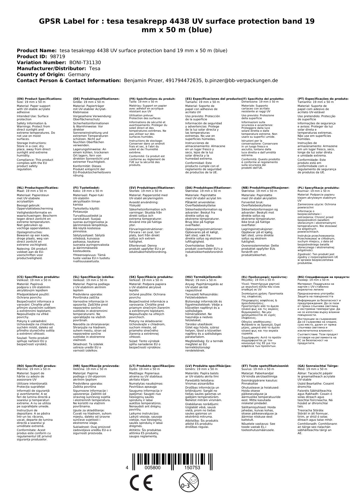 Stellen Sie eine Frage, um mehr über das Produkt zu erfahrentesakrepp® 4438 UV besteht aus einem sehr stabilen, feuchtigkeitsunempfindlichen, glatten Papierträger, der mit einer UV-stabilen Acrylat-Klebmasse beschichtet ist.