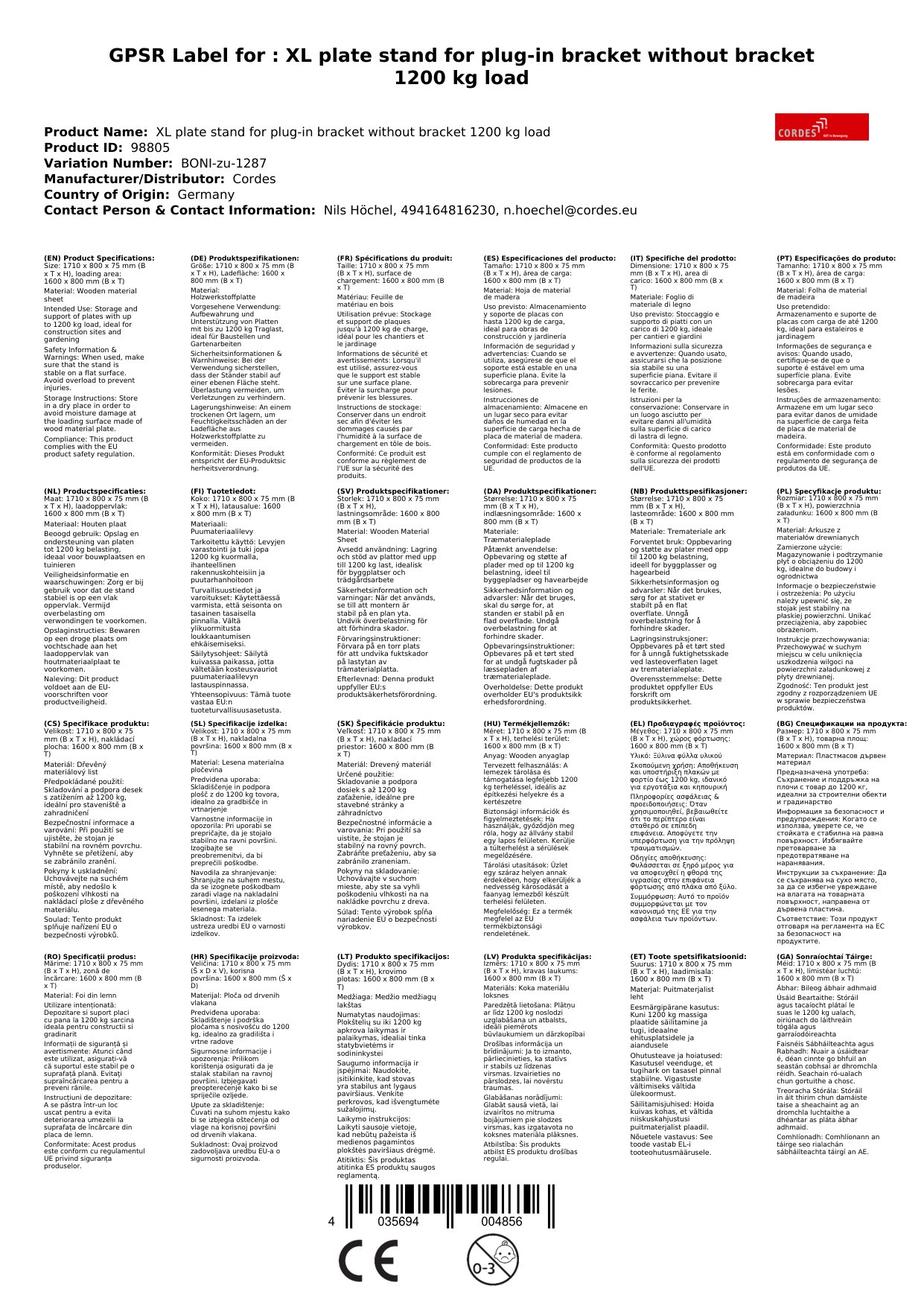 Plattenständer, 1200 kg Traglast, XL, für Einsteckbügel, ohne Bügel
