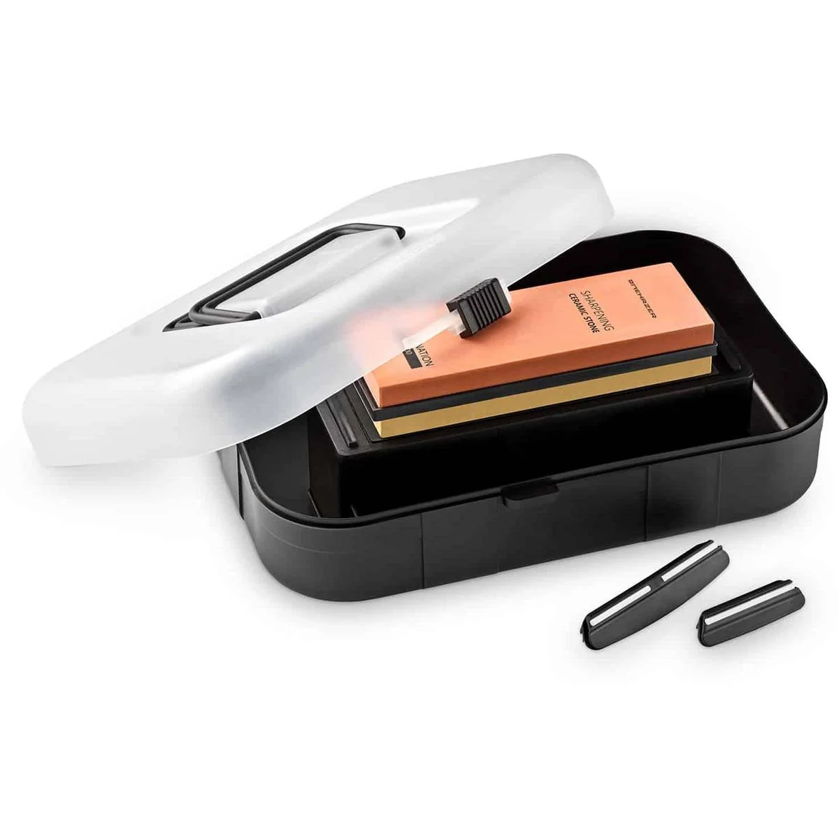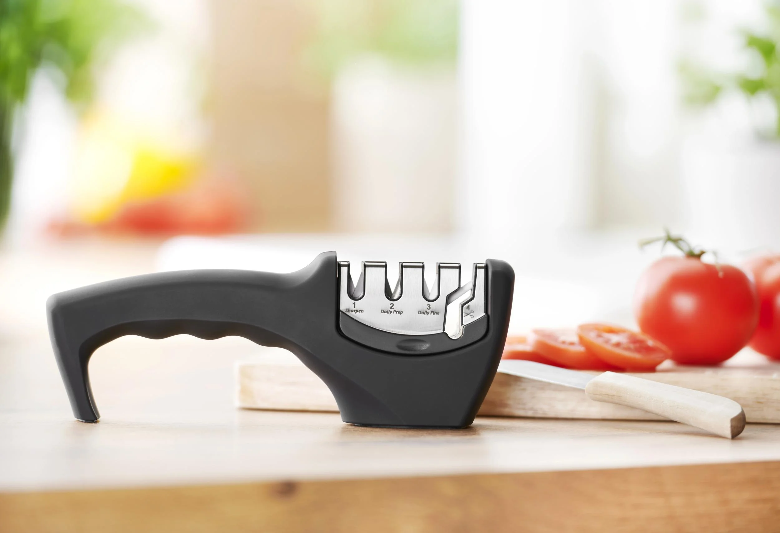 Messer werden in regelmäßigen Abständen geschliffen, um die Klinge gerade und somit scharf zu halten. Durch einen Schleifstein werden kleine Kerben und Unregelmäßigkeiten im Material entfernt, sodass wieder eine ebenmäßige Linie entsteht und das Messer besser schneiden kann. Alternativ kann das Messer mit einem Wetzstahl geschärft werden. Wichtig ist, dass Sie im richtigen Winkel von 15 bis 20 Grad arbeiten, den Schleifstein feucht halten und nicht abwarten, bis die Klinge bereits stumpf ist, weil Sie dann besonders viel Material entfernen müssen. Abschließend wird mit der feineren Körnung des Schleifsteins nachgearbeitet und mit einer Polierpaste die Schnittfläche perfektioniert. Wer sich unsicher ist, kann einen sogenannten Messerschärfer mit Grob- und Feinschliff nutzen, durch den die Klinge in mehreren Arbeitsschritten hindurchgezogen und auf diese Weise geschärft wird.