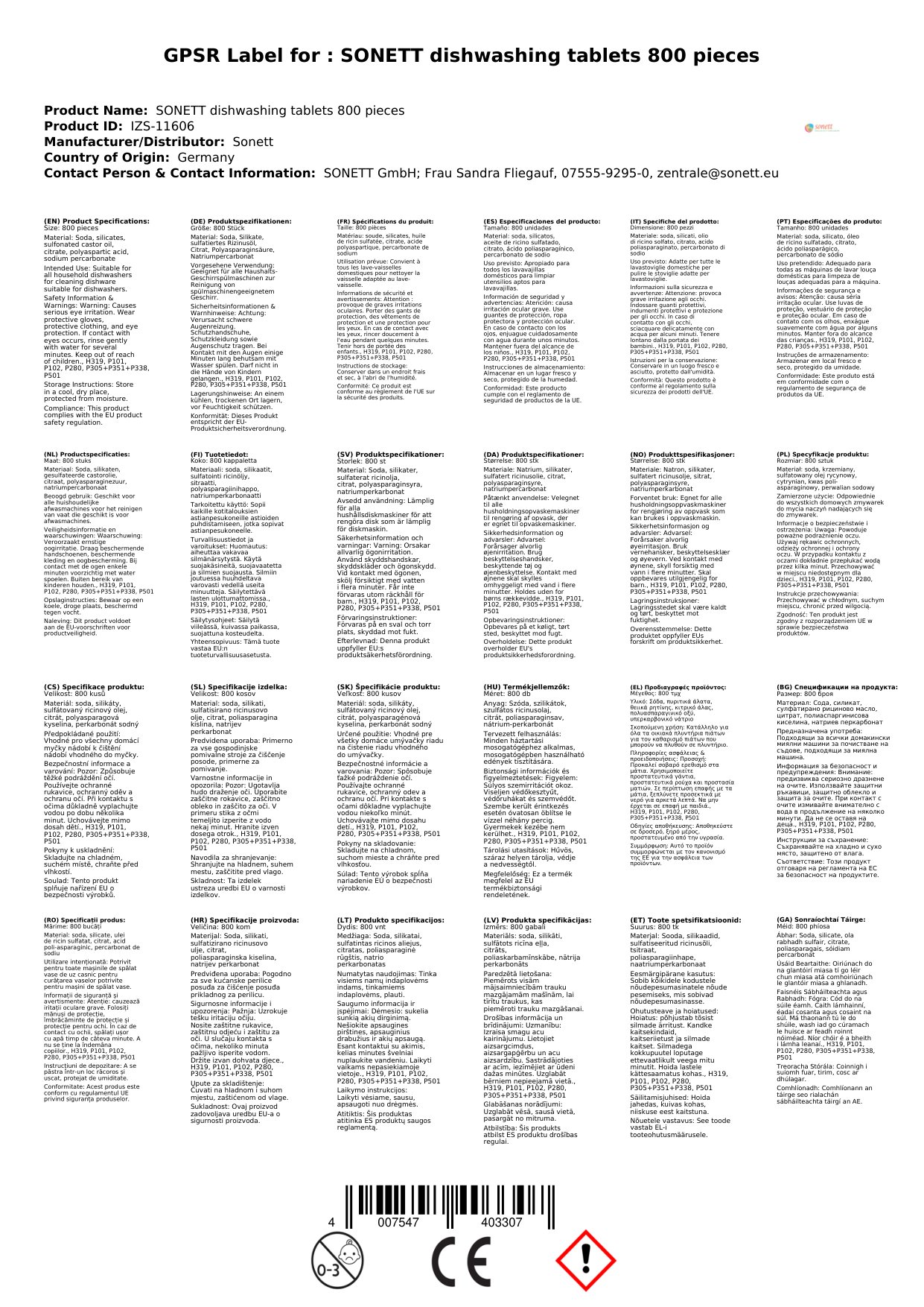Stellen Sie eine Frage, um mehr über das Produkt zu erfahrenSonett Tabs für Geschirrspülmaschinen 800 Stück lose im Karton