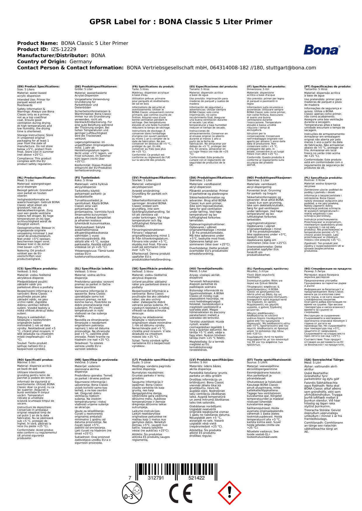Bona Classic ist ein wasserbasierter Einkomponenten-Grundlack auf Acrylatbasis. Zum Grundieren aller gebräuchlichen Parketthölzer, die mit Bona Wasserlacken versiegelt werden sollen.
