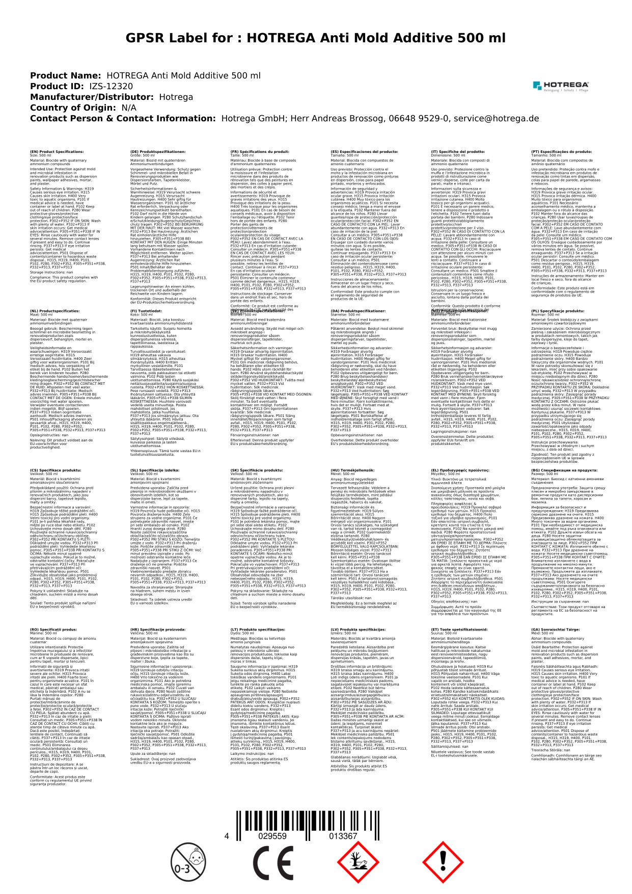 Stellen Sie eine Frage, um mehr über das Produkt zu erfahrenHotrega Anti Schimmel Zusatz 500 ml Flasche