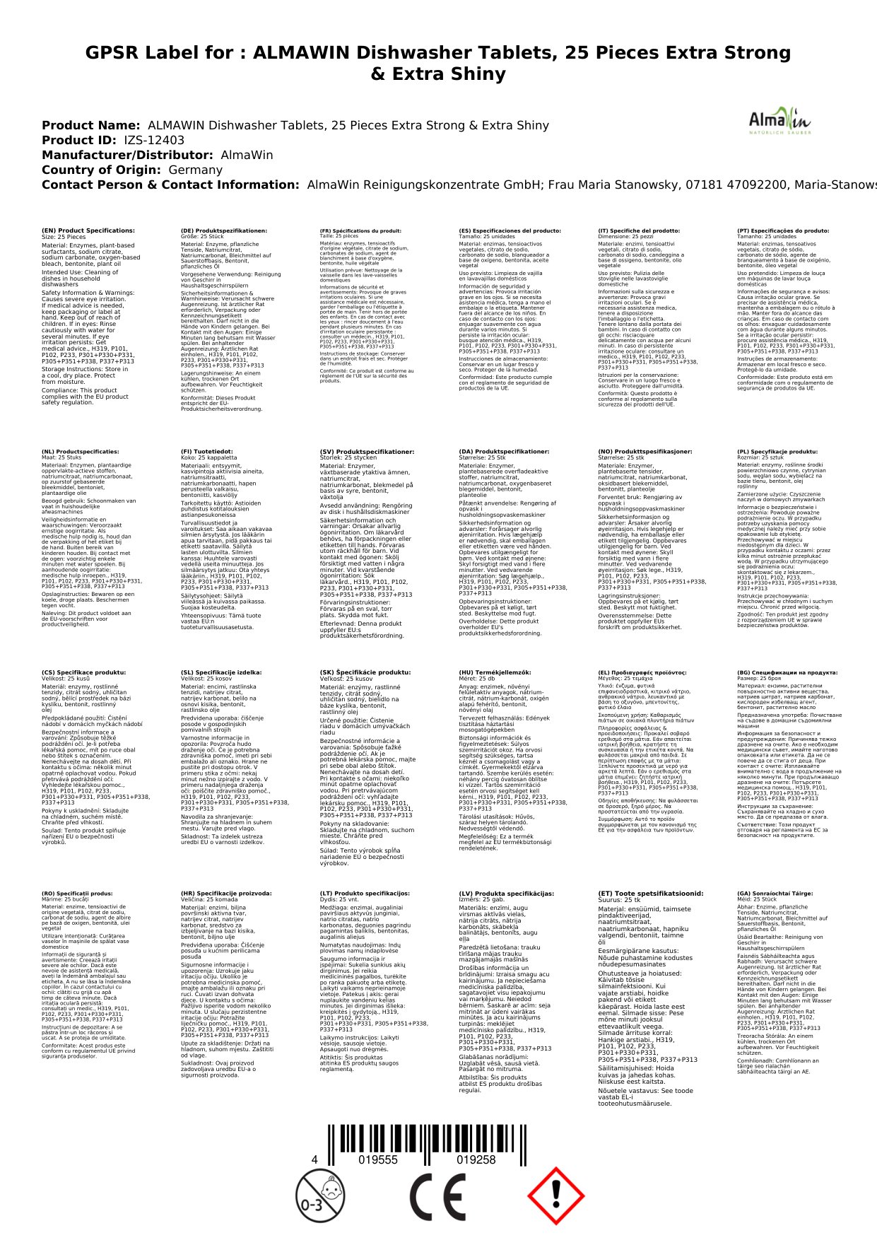 Almawin Spülmaschinen-Tabs sind frei von Phosphat, Chlor und Petrochemie. Sie enthalten gentechnikfreie Enzyme, die Rezeptur mit der Powerformel sorgt für reine Sauberkeit und strahlenden Glanz, hartnäckige Speiserückstände, Fett, Stärke und Eiweiß werden wirkungsvoll entfernt. Wir produzieren regional in der Nähe von Stuttgart und setzen auf natürliche Rohstoffe.