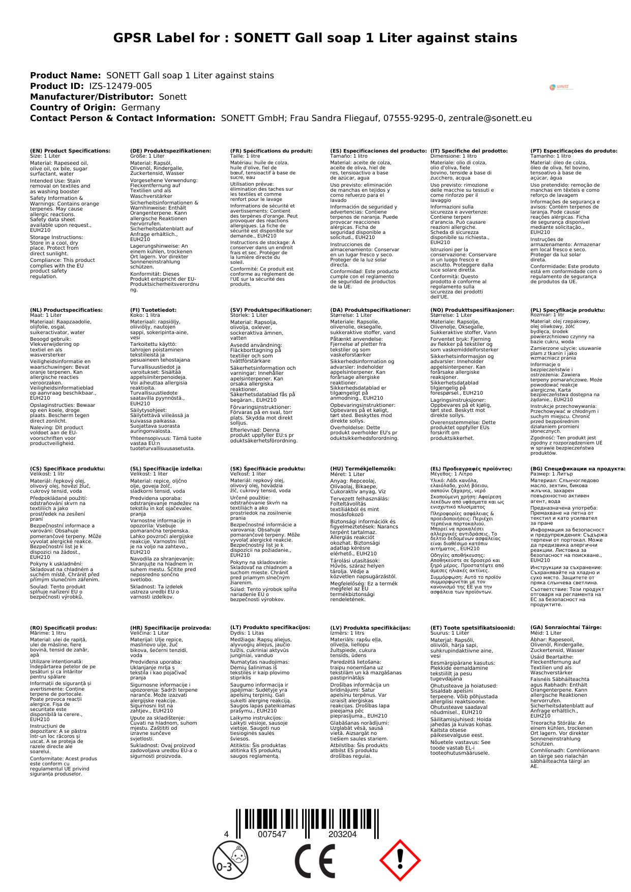 Rindergalle gehört zu den traditionellen Fleckenmitteln, deren Hauptwirkstoffe, die Gallensäuren Chol- und Taurocholsäure, Fette und fettähnliche Stoffe fein dispergieren, sowie Farbstoffe lösen und an sich binden können. Seife, hergestellt aus Rapsöl und Olivenöl mit Lauge quillt und löst den Schmutz und unterstützt die Fleckenlösekraft der Rindergalle. Zuckertensid wird aus den rein pflanzlichen Rohstoffen Zucker, Stärke und Kokosfett durch chemische Umsetzungen mit Hilfe von Säuren gewonnen. Orangenterpene aus Orangenschalen verstärken zusätzlich die Fettlösekraft der Sonett Gallseife.