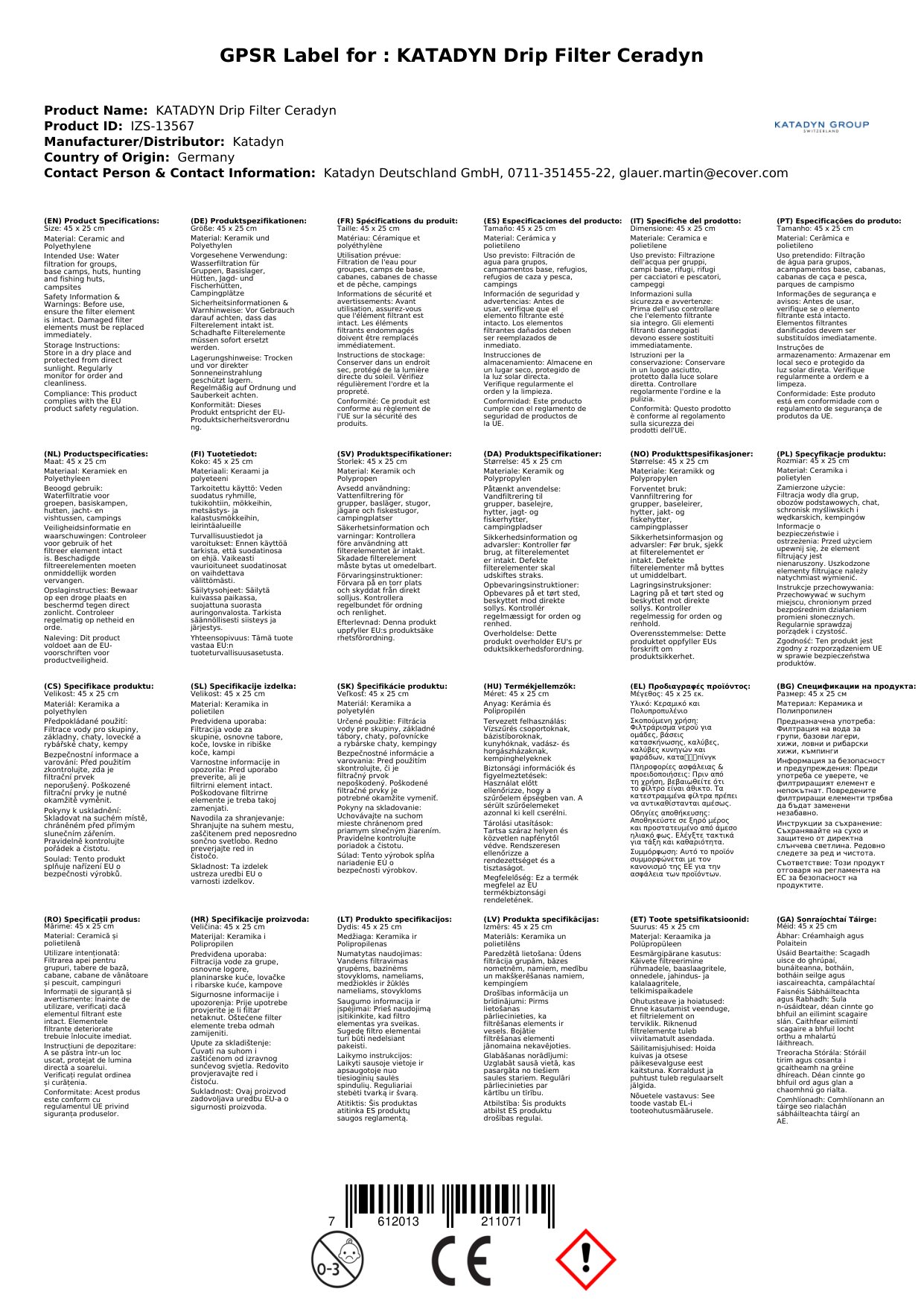 Stellen Sie eine Frage, um mehr über das Produkt zu erfahrenKatadyn Drip Filter Ceradyn (Keramikfilter - Tropffilter)