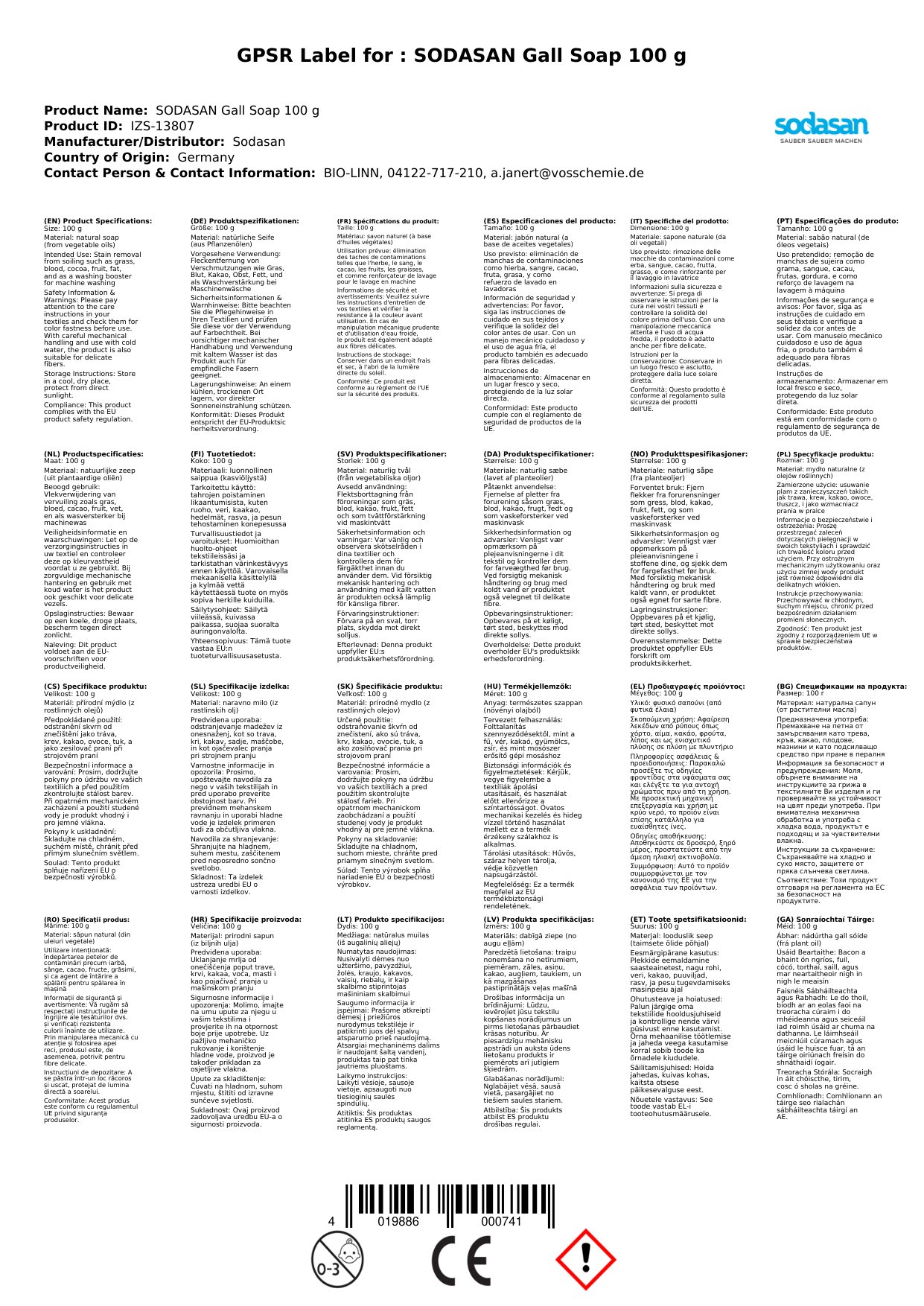 SODASAN Gallseife ist ein wirksames Mittel zur Entfernung von Flecken wie Gras, Blut, Fett, Kakao, Tinte, Kugelschreiber oder Obst. Das Produkt kann auch verwendet werden als Waschverstärkung des Waschmittels bei der Maschinenwäsche.