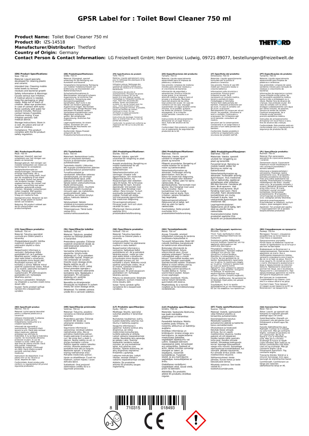 Thetford Toilet Bowl Cleaner 750 ml