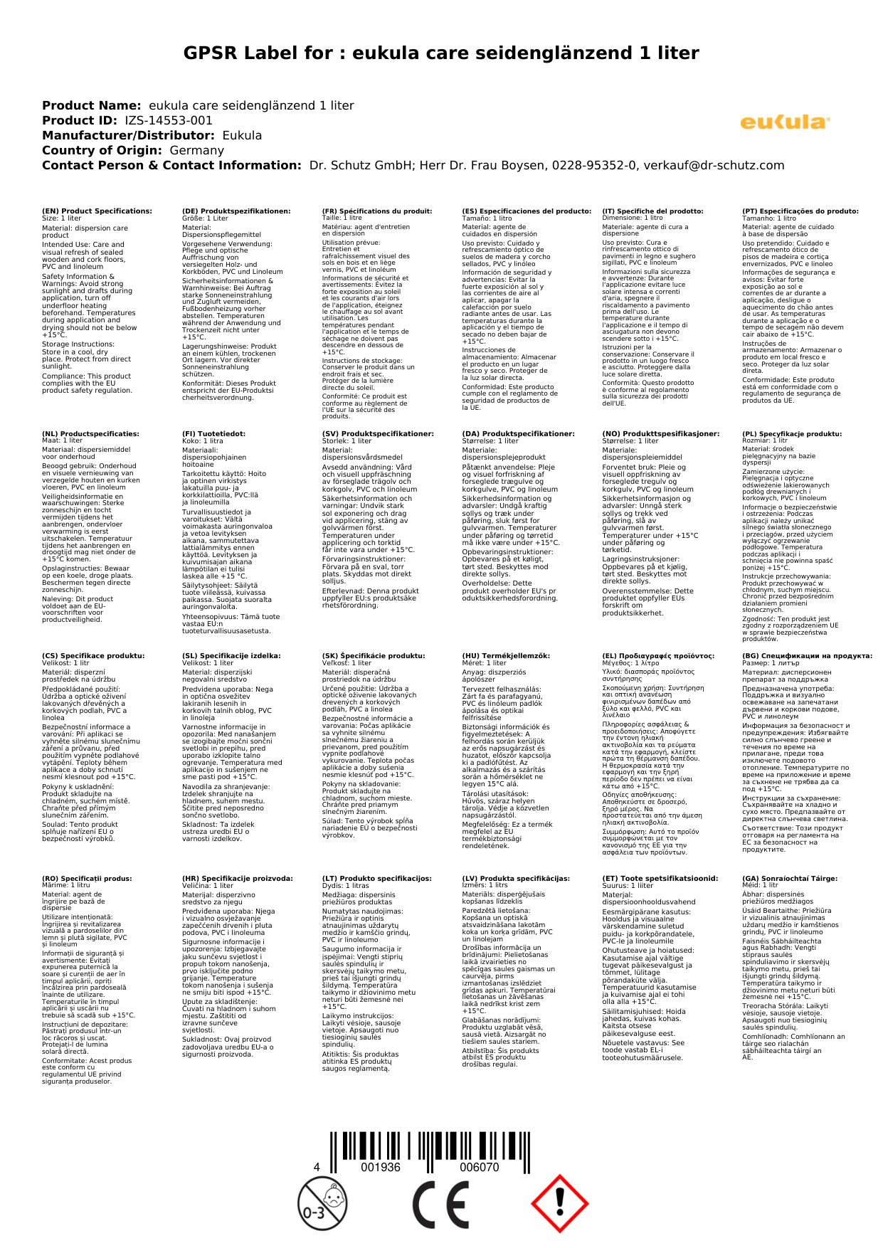 Das eukula care ist ein Dispersionspflegemittel für alle versiegelten und lackierte Flächen wie Holz- und Korkböden, PVC und Linoleum. Die Wischpflege schützt den Boden vor Abrieb und sollte in regelmäßigen Pflegezyklen erneuert werden, nach einer entsprechenden Grundreinigung. Das Siegel schützt Ihren Boden nachhaltig, ist nach der Trocknung wischfest und muss nicht auspoliert werden.