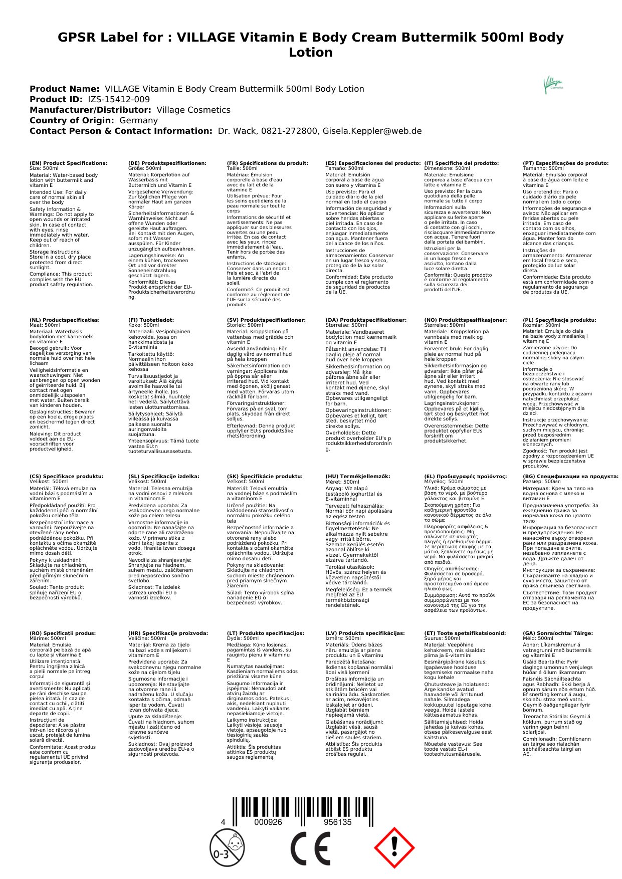 VILLAGE Vitamin E Bodycream Buttermilch 500ml Körperlotion